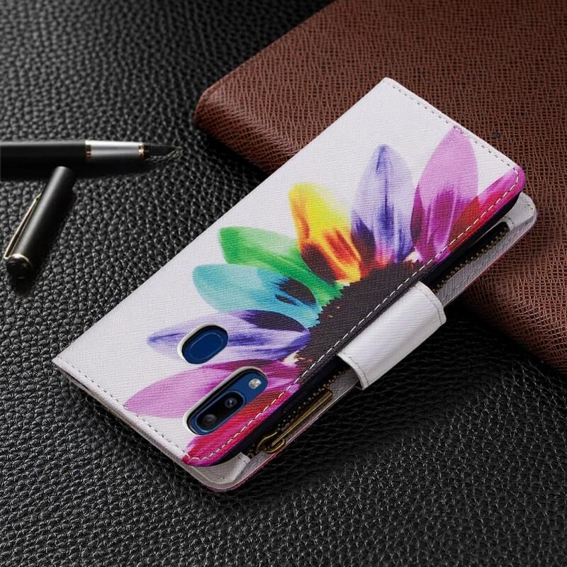 Θήκη δέρματος οριζόντιας αναδίπλωσης με φερμουάρ και σχέδια ζωγραφικής για Samsung Galaxy A10e/A20e, με βάση για στήριξη, θήκες για κάρτες και πορτοφόλι (Ηλιάνθος)