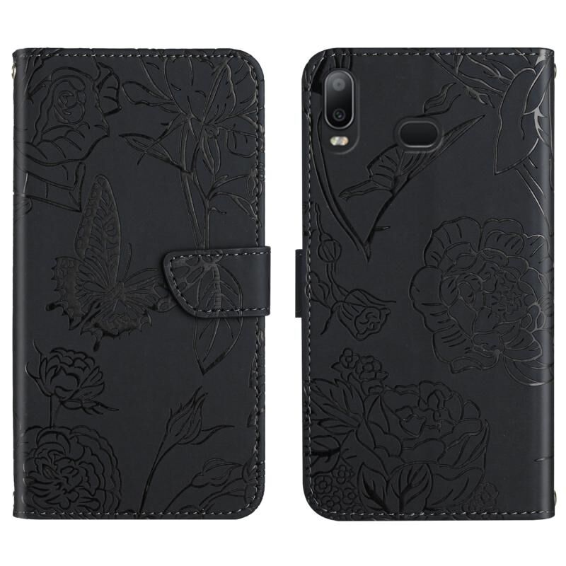 Θήκη τηλεφώνου Samsung Galaxy A10s με δερμάτινη υφή, ανάγλυφο σχέδιο πεταλούδας και παιώνιας (Μαύρο)