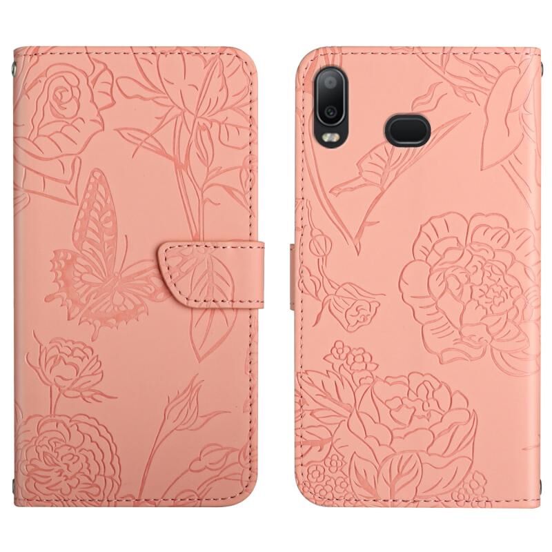 Θήκη τηλεφώνου Samsung Galaxy A10s με δερμάτινη υφή, ανάγλυφο σχέδιο πεταλούδας και παιώνιας (ρόζ)