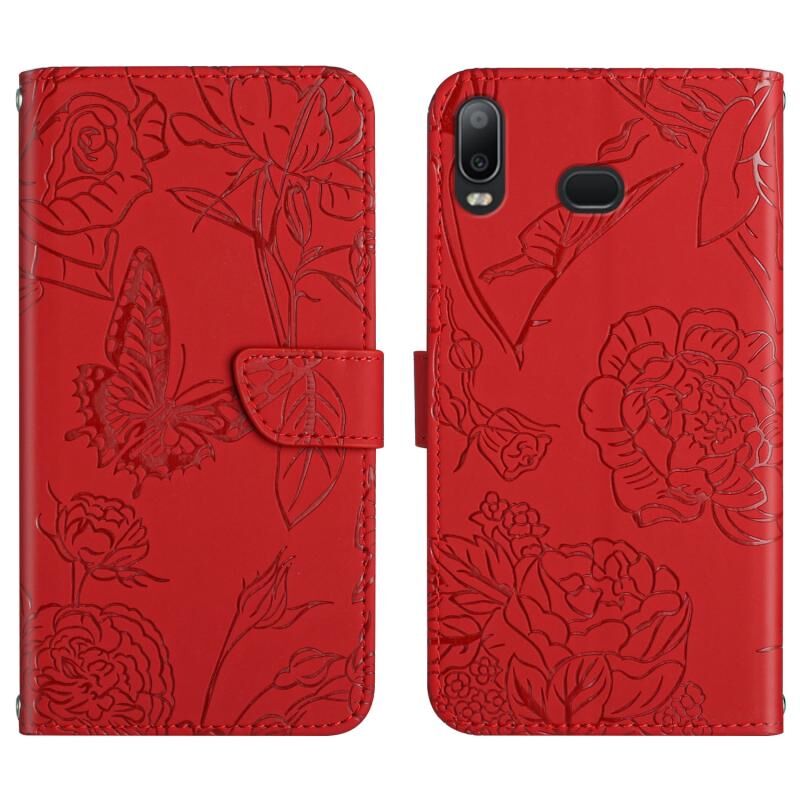Θήκη τηλεφώνου Samsung Galaxy A10s με δερμάτινη υφή, ανάγλυφο σχέδιο πεταλούδας και παιώνιας (Κόκκινο)