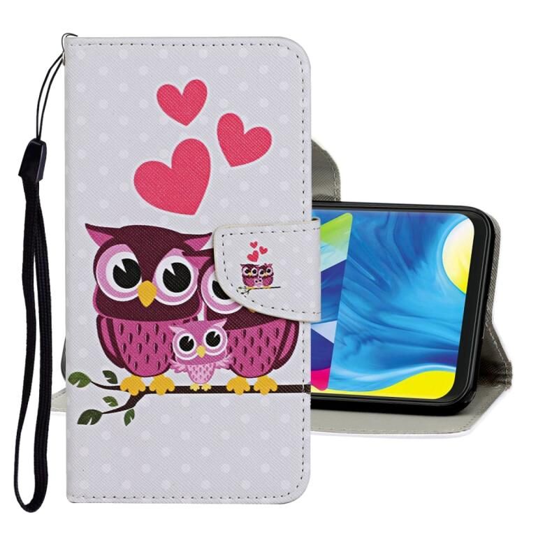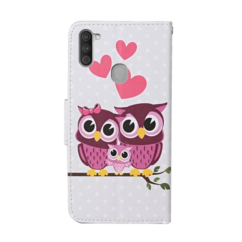 Θήκη Samsung Galaxy A11 Δερμάτινη Οριζόντια με σχέδιο πολύχρωμου σχεδίου, βάση στήριξης & θήκες για κάρτες & πορτοφόλι (Κουκουβάγια)