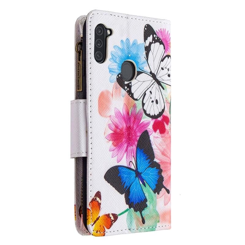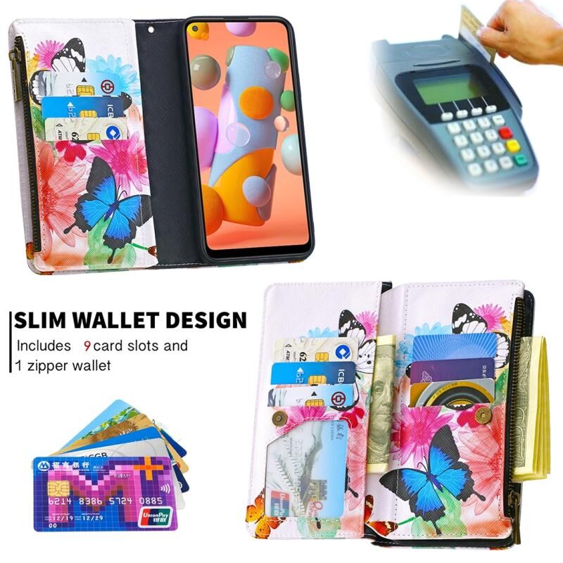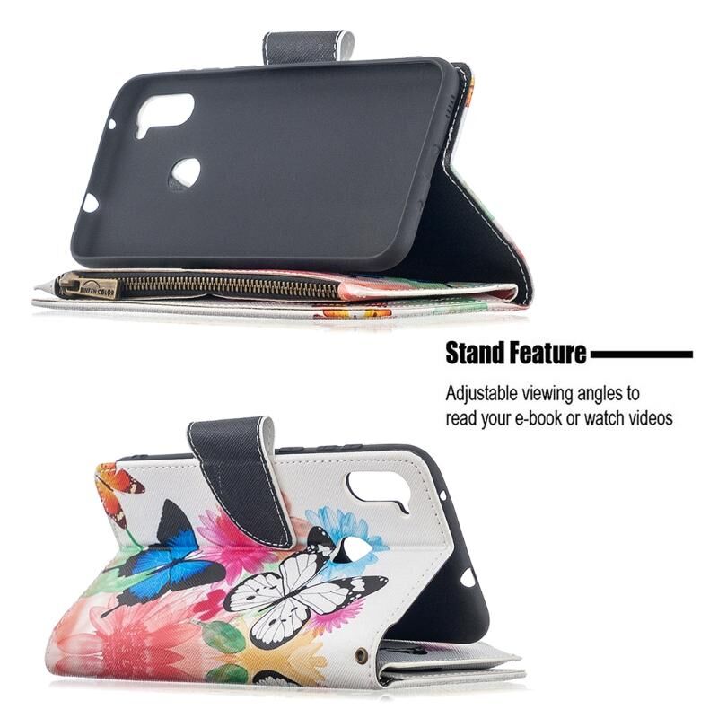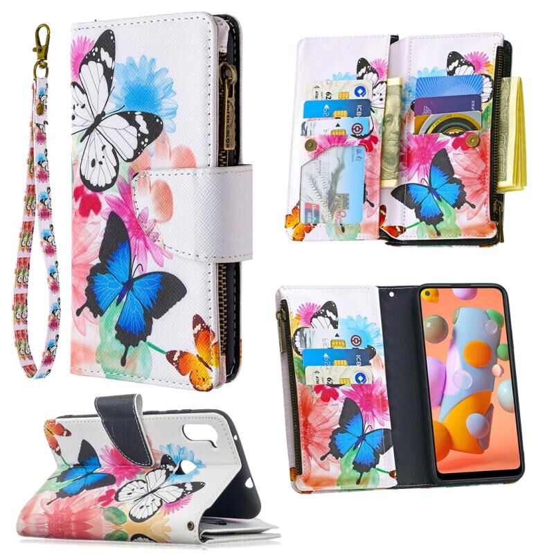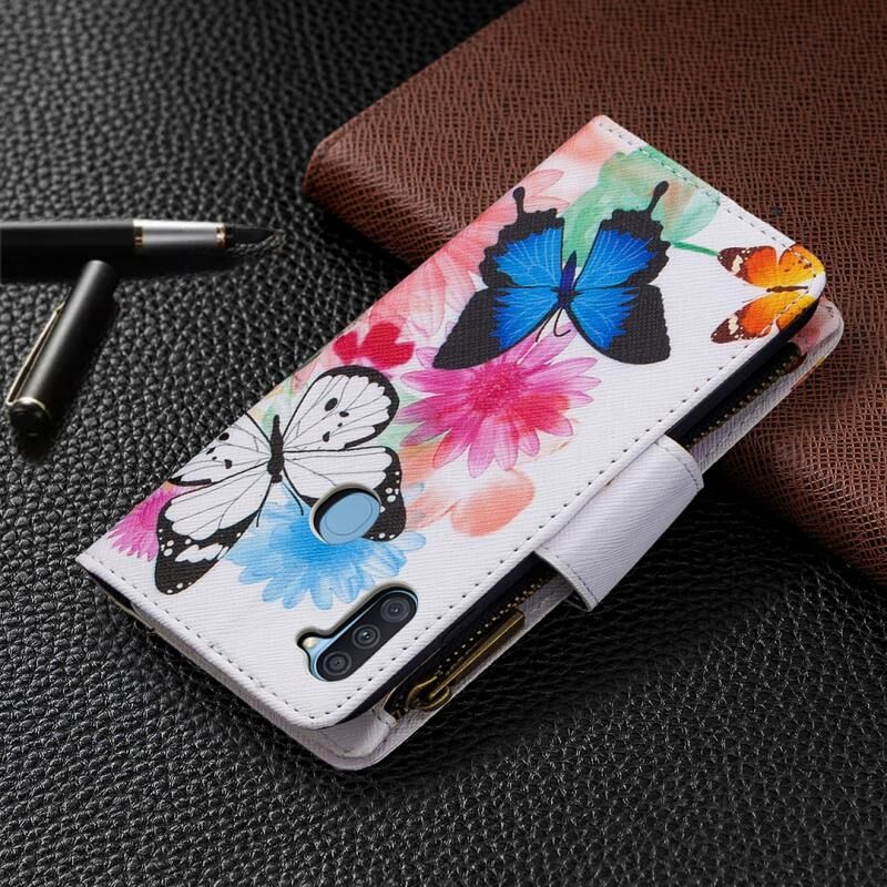 Θήκη Samsung Galaxy A11 Δερμάτινη Οριζόντια με Φερμουάρ, Πολύχρωμο Σχέδιο Ζωγραφικής με Θήκη & Θήκες Καρτών & Πορτοφόλι (Δύο Πεταλούδες)