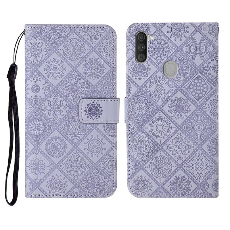 Θήκη Samsung Galaxy A11, Εθνοτικό Στυλ, ανάγλυφο σχέδιο, οριζόντια, δερμάτινη με βάση & θήκες καρτών & πορτοφόλι & κορδόνι (Μωβ)