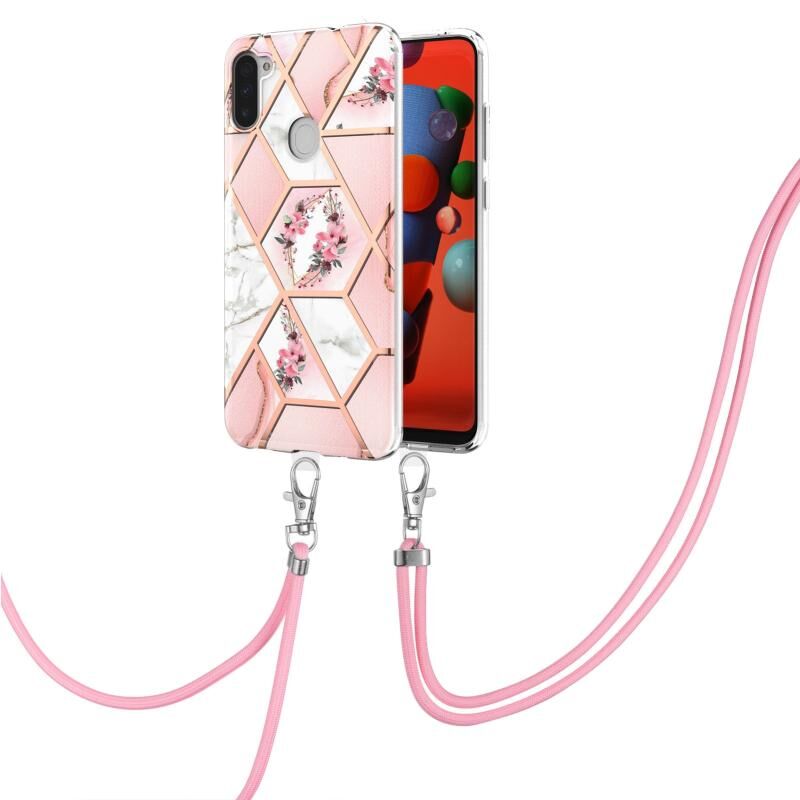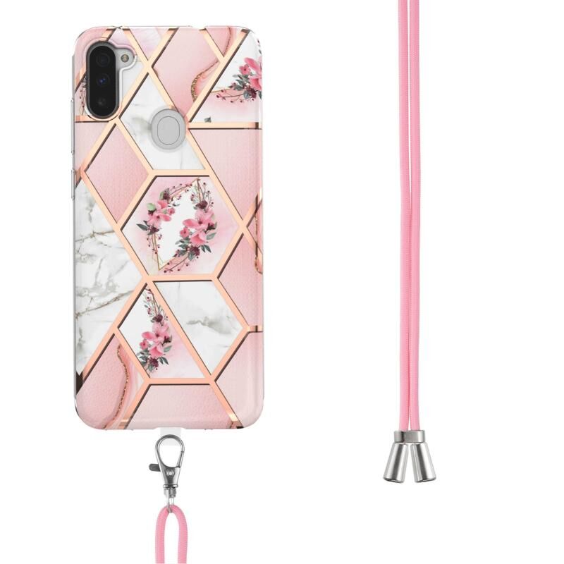 Θήκη για Samsung Galaxy A11 / M11 με επιμετάλλωση, συνδυασμό μαρμάρου και λουλουδιών, από TPU με προστασία από κραδασμούς και λουρί (Ροζ Λουλούδι)