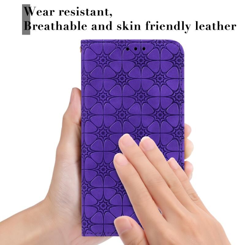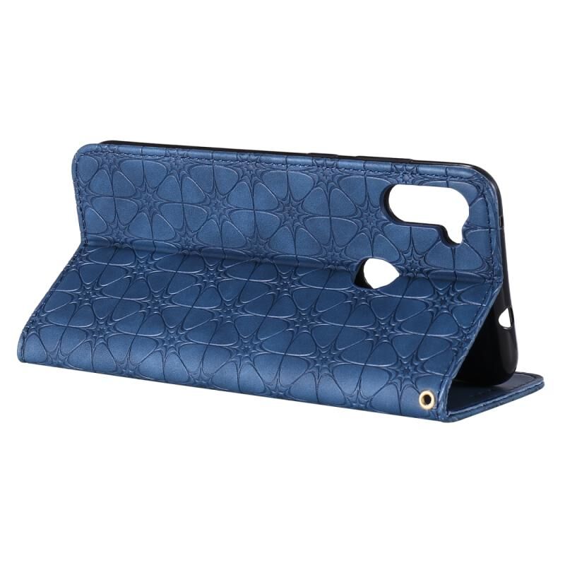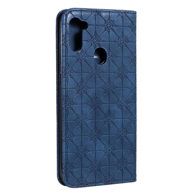 Θήκη Samsung Galaxy A11 / M11 από δέρμα με μαγνητικό κλείσιμο, οριζόντια, με ανάγλυφο σχέδιο λουλουδιών, βάση στήριξης & θήκες για κάρτες (Σκούρο Μπλε)