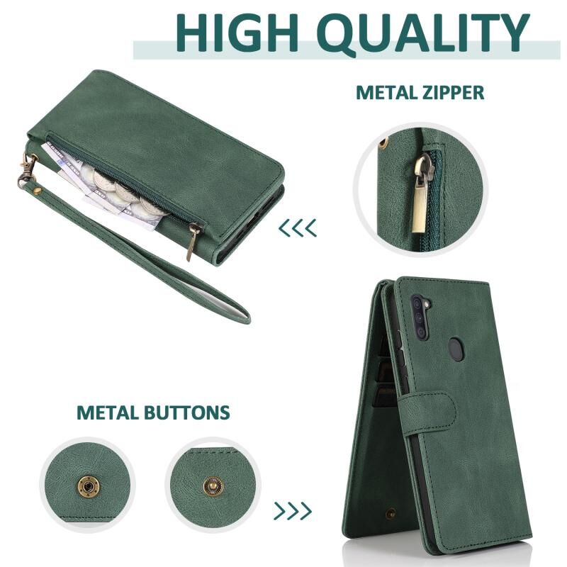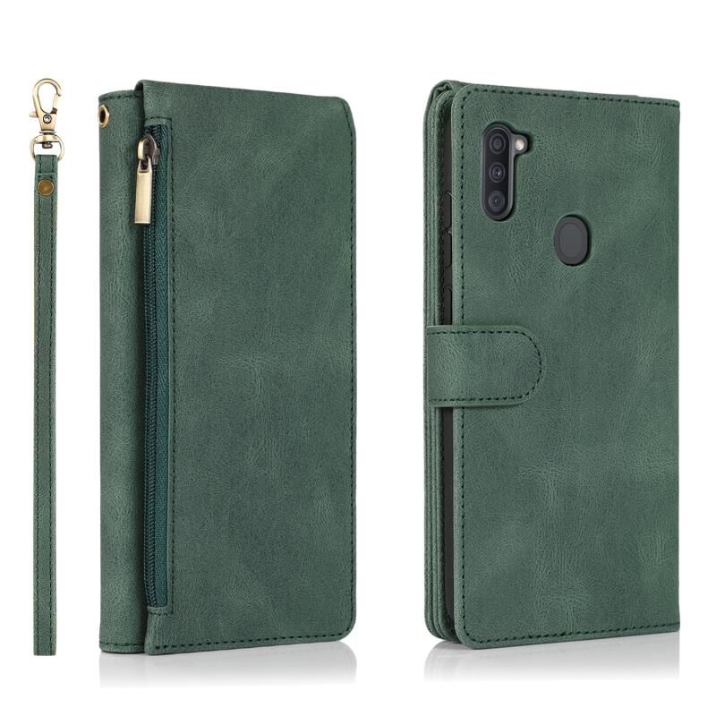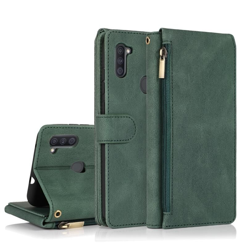 Για Samsung Galaxy A11 Skin-feel Crazy Horse υφή φερμουάρ τσάντα πορτοφόλι οριζόντια Flip δερμάτινη θήκη με κάτοχο & υποδοχές για κάρτες & πορτοφόλι & κορδόνι (σκούρο πράσινο)