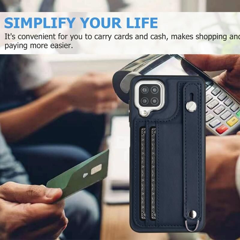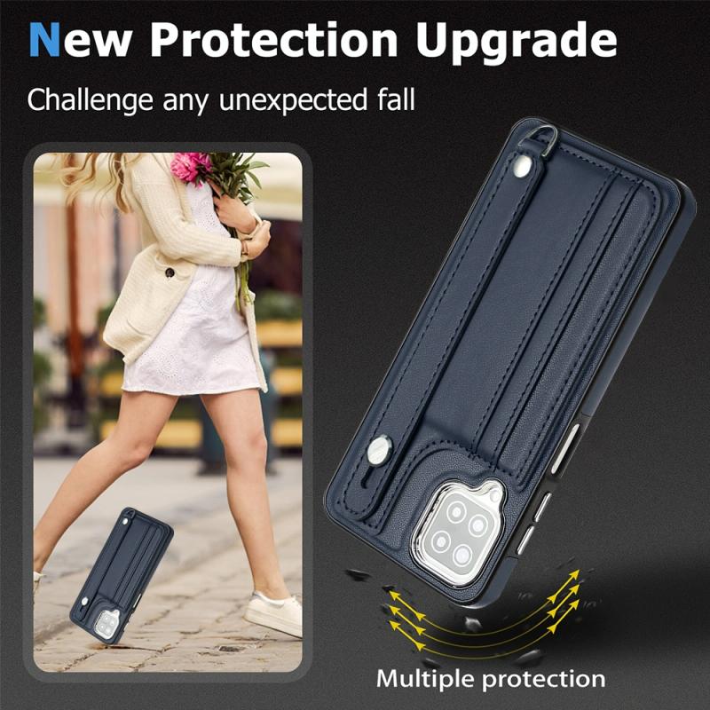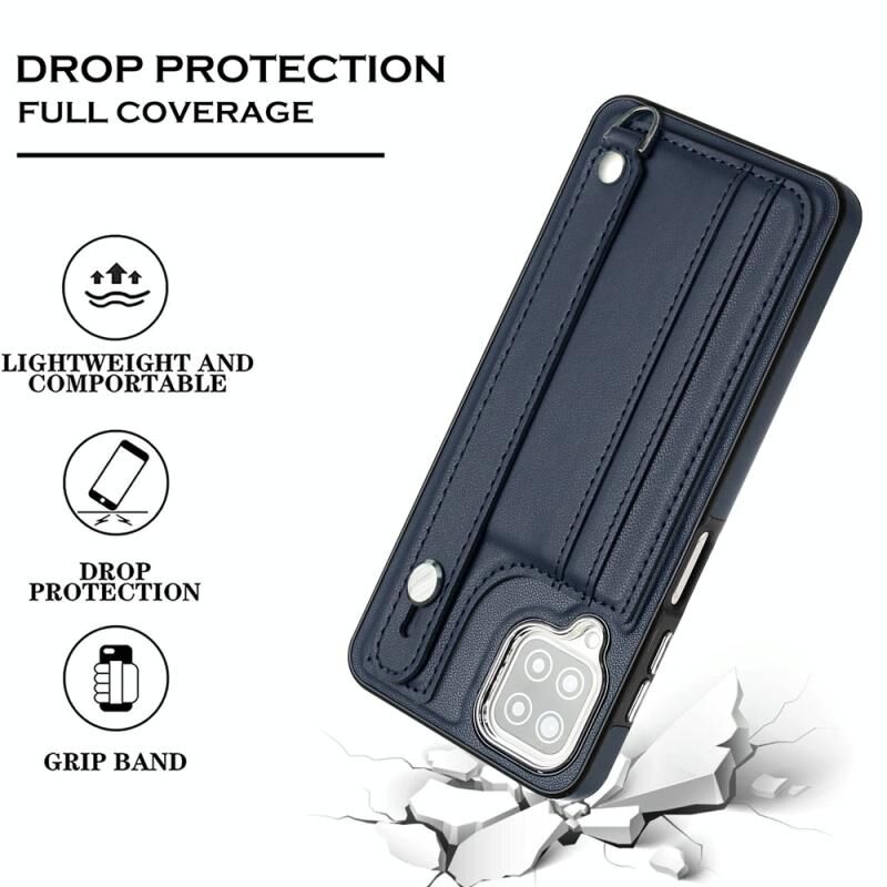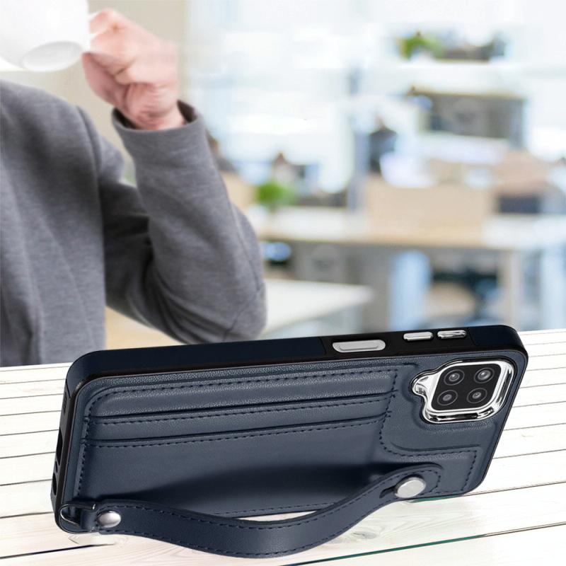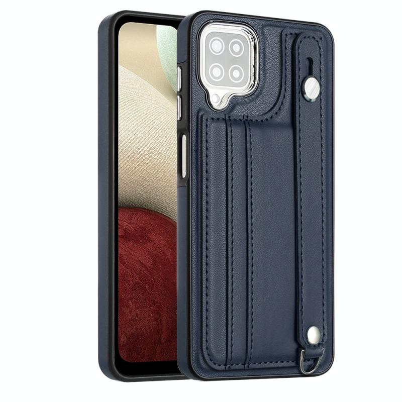 Θήκη κινητού τηλεφώνου από δέρμα ανθεκτική στις κρούσεις για Samsung Galaxy A12 4G / M12 με λουρί καρπού (Μπλε)