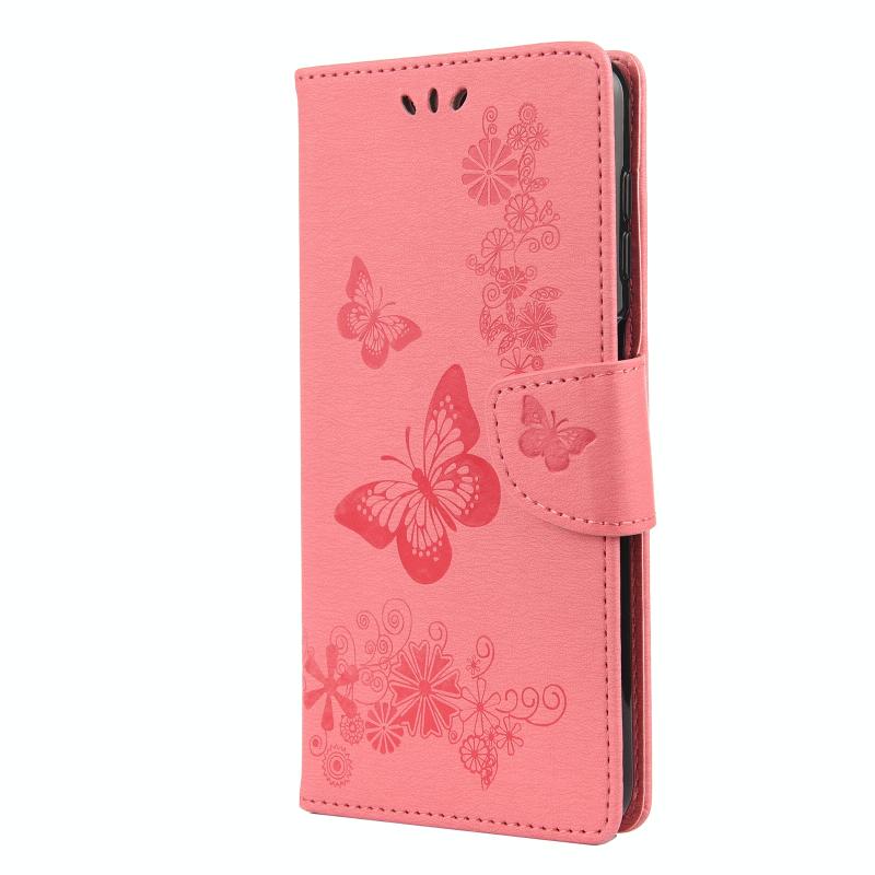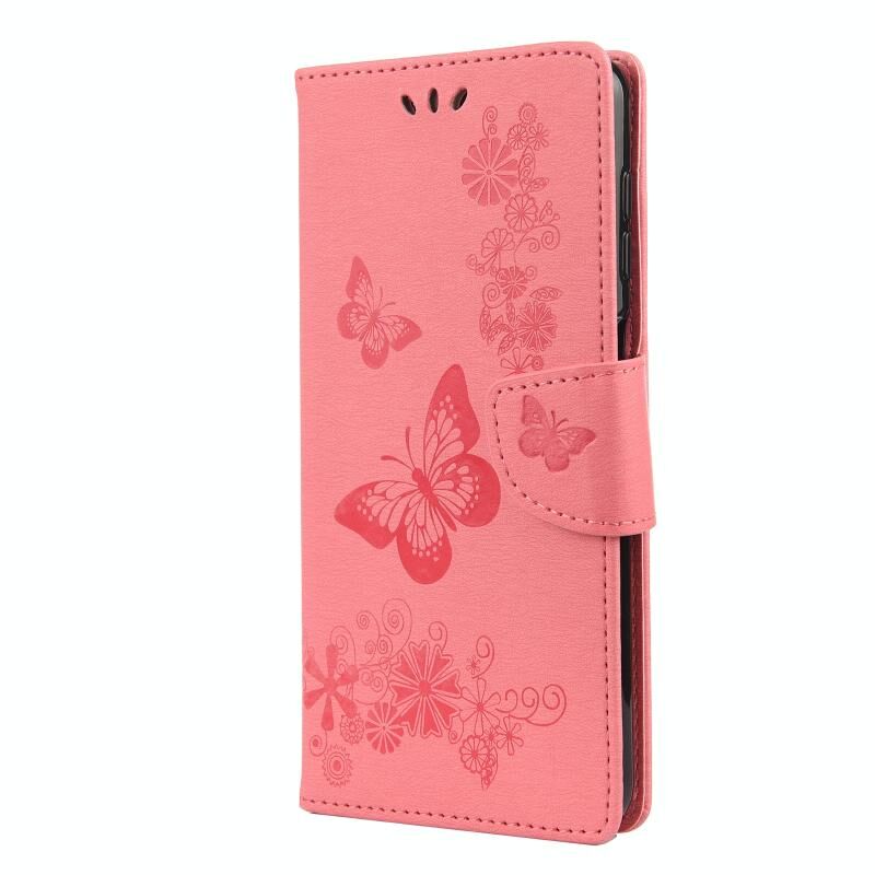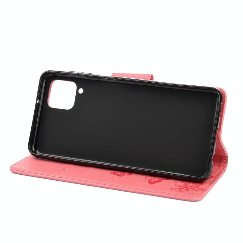 Θήκη Samsung Galaxy A12 5G με ανάγλυφο σχέδιο πεταλούδων, οριζόντια, από δέρμα με βάση στήριξης & θήκες για κάρτες & πορτοφόλι (Ροζ)