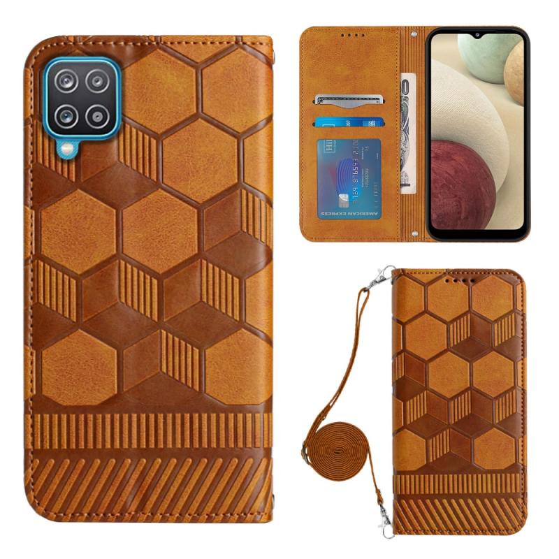 Θήκη κινητού τηλεφώνου Samsung Galaxy A12 5G/M12/F12 με σταυρωτό λουρί, υφή ποδοσφαίρου, μαγνητική, από PU δέρμα (Χακί)