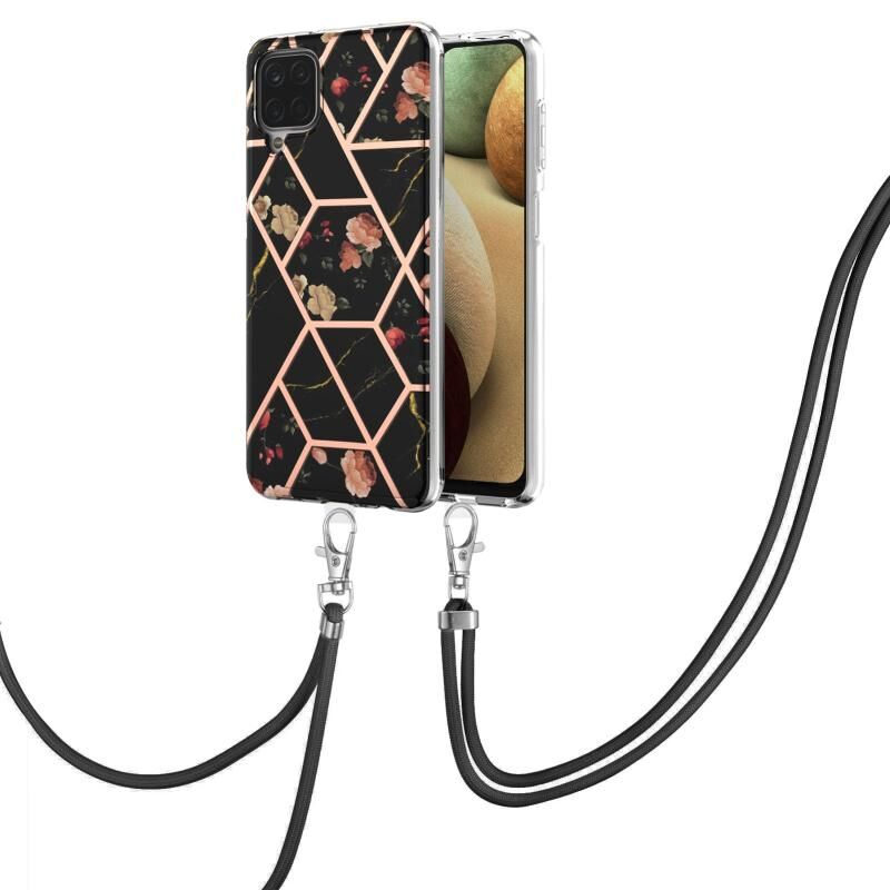 Θήκη για Samsung Galaxy A12 5G / M12 / F12 με επιμετάλλωση, συνδυασμό μαρμάρου και λουλουδιών, από TPU, αντικραδασμική με κορδόνι (Ροζ Λουλούδι)