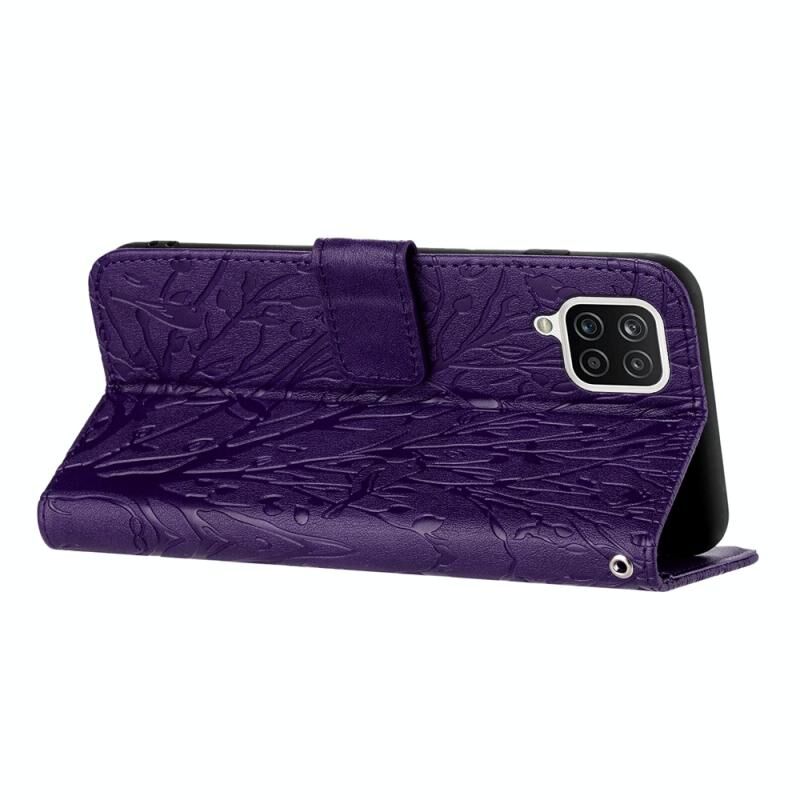For Samsung Galaxy A12 5G Tree Birds Embossed Pattern Leather Phone Case(Purple)