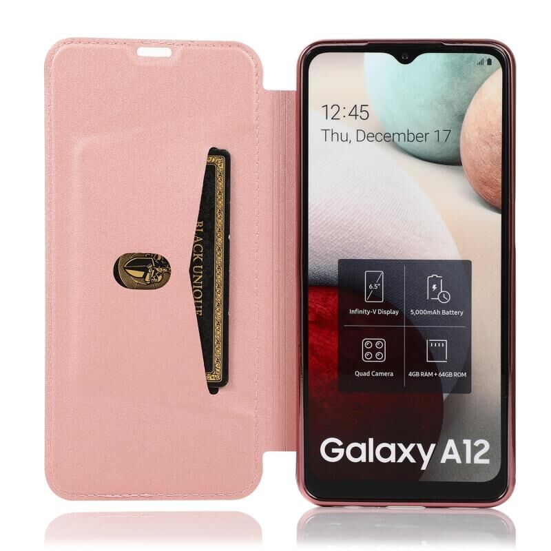 Θήκη δέρματος οριζόντιας αναδίπλωσης PU + TPU με επιμετάλλωση bronzing για Samsung Galaxy A12 / A42 5G με βάση & υποδοχή κάρτας (Μαύρο)