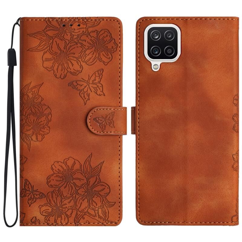 Θήκη κινητού τηλεφώνου Samsung Galaxy A12 Cherry Blossom Butterfly με ανάγλυφη υφή PU (Μωβ)