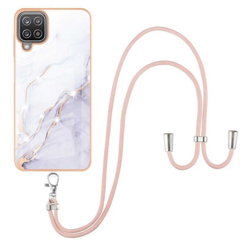 Θήκη για Samsung Galaxy A12 με Επικάλυψη Ηλεκτρολυτικής Μαρμάρου, IMD, TPU, Αντικραδασμική με Λουρί Λαιμού (Μωβ 002)