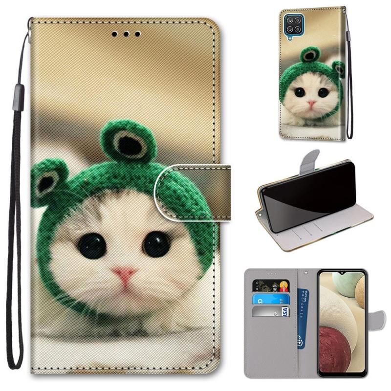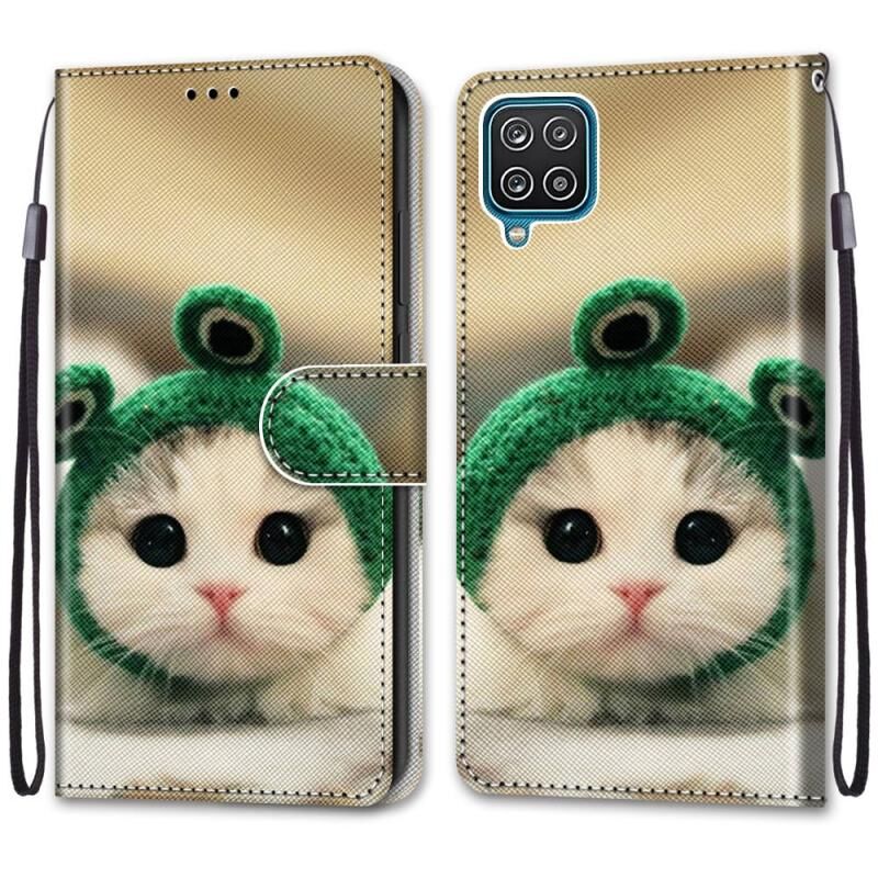Θήκη για Samsung Galaxy A12 / M12 με πολύχρωμο σχέδιο, υφή σταυρού, οριζόντια, από δερματίνη PU με βάση στήριξης & θήκες για κάρτες & πορτοφόλι & κορδόνι (Φρόγκος Γατάκι)