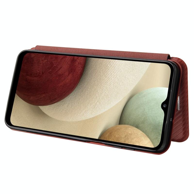Θήκη για Samsung Galaxy A12 / M12 / F12 με υφή ανθρακονήματος, οριζόντια, από TPU + PC + Δερματίνη PU με θήκη για κάρτες (Καφέ)