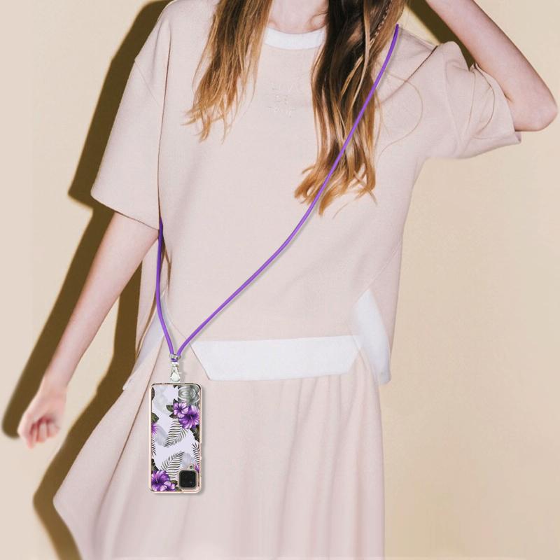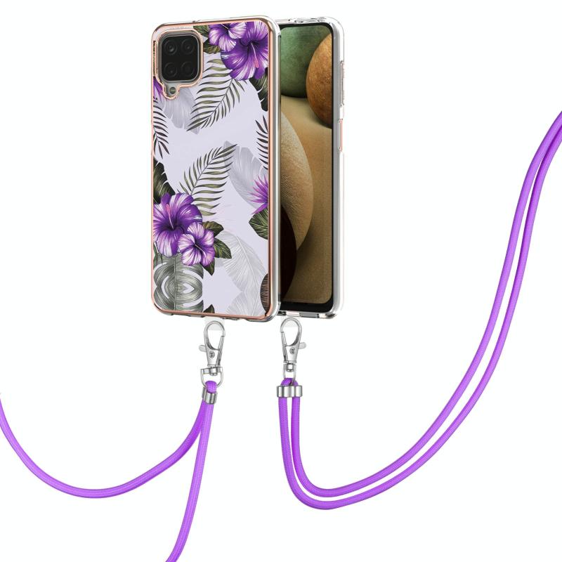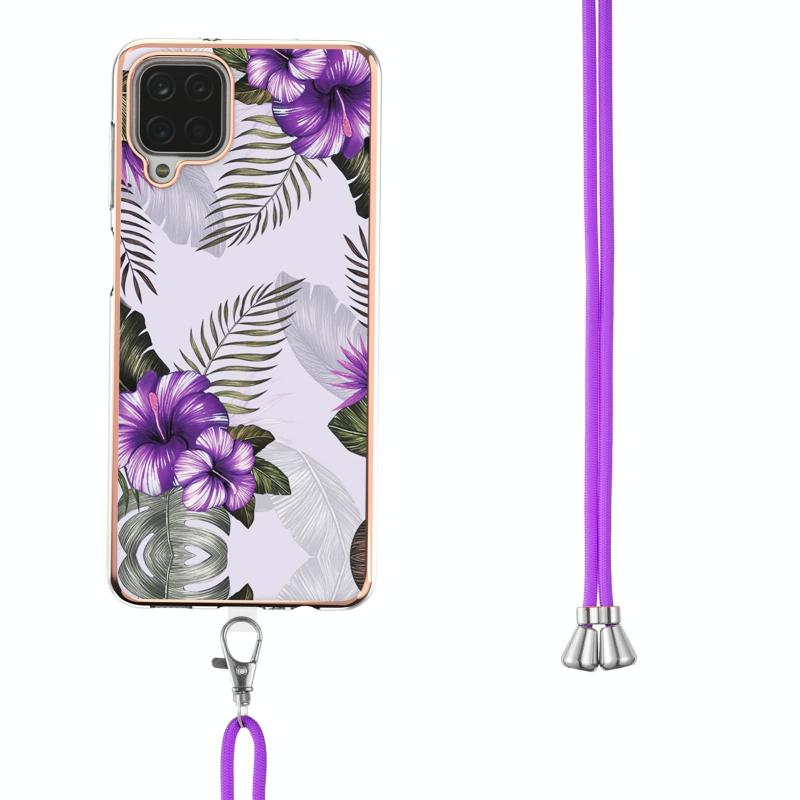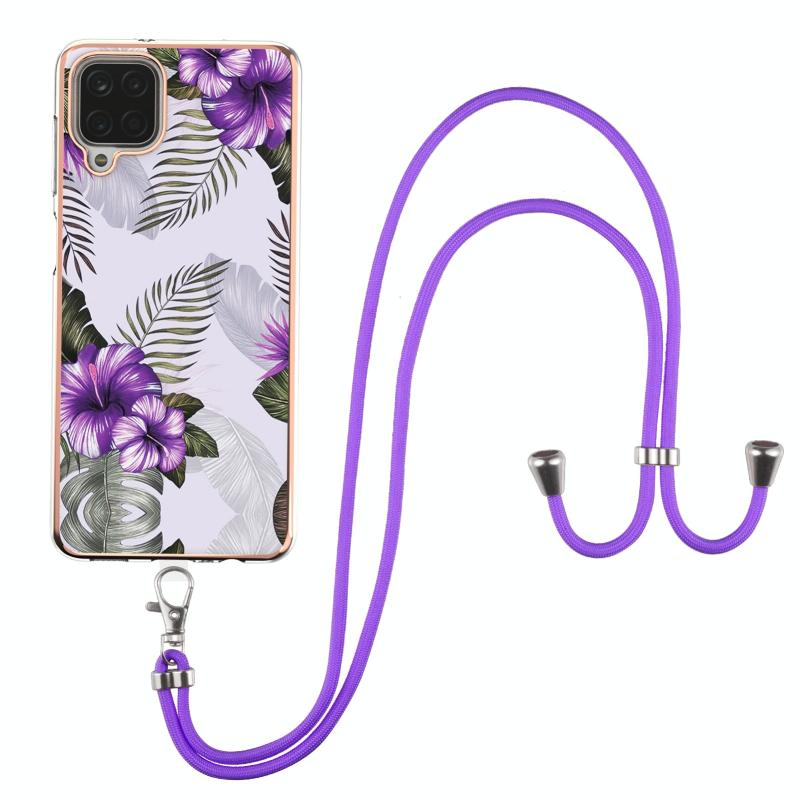 For Samsung Galaxy A12/M12/F12 Electroplating Pattern IMD TPU Shockproof Case with Neck Lanyard(Purple Flower)