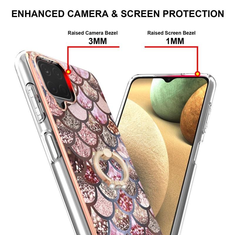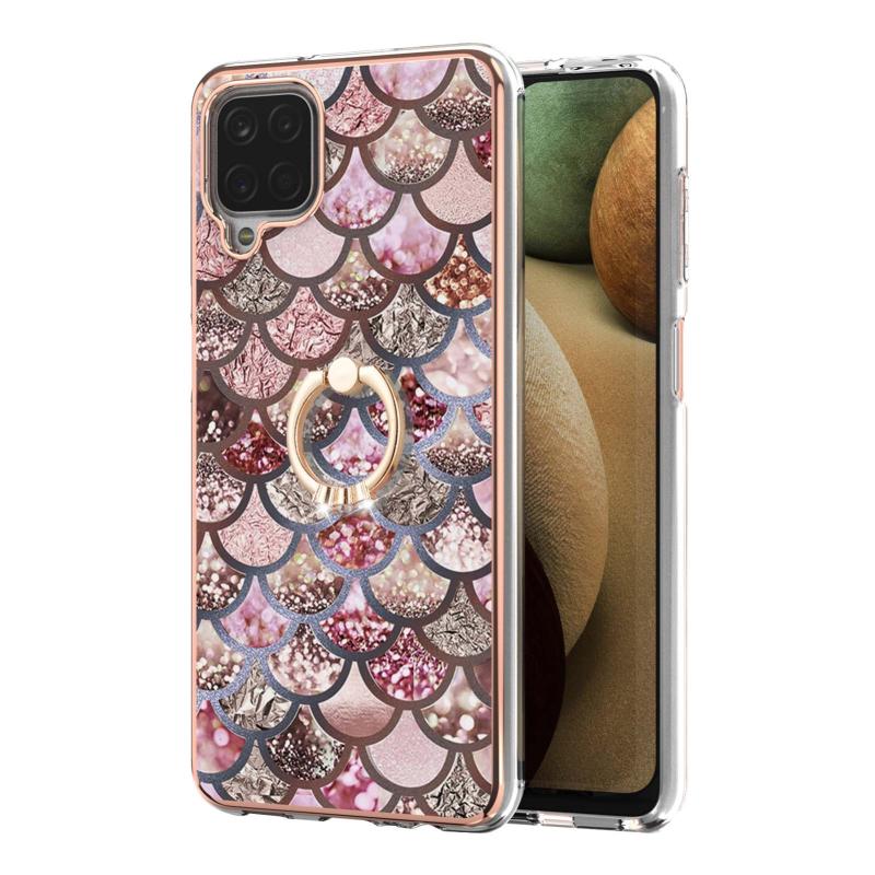 For Samsung Galaxy A12/M12/F12 Electroplating Pattern IMD TPU Shockproof Case with Rhinestone Ring Holder(Pink Scales)