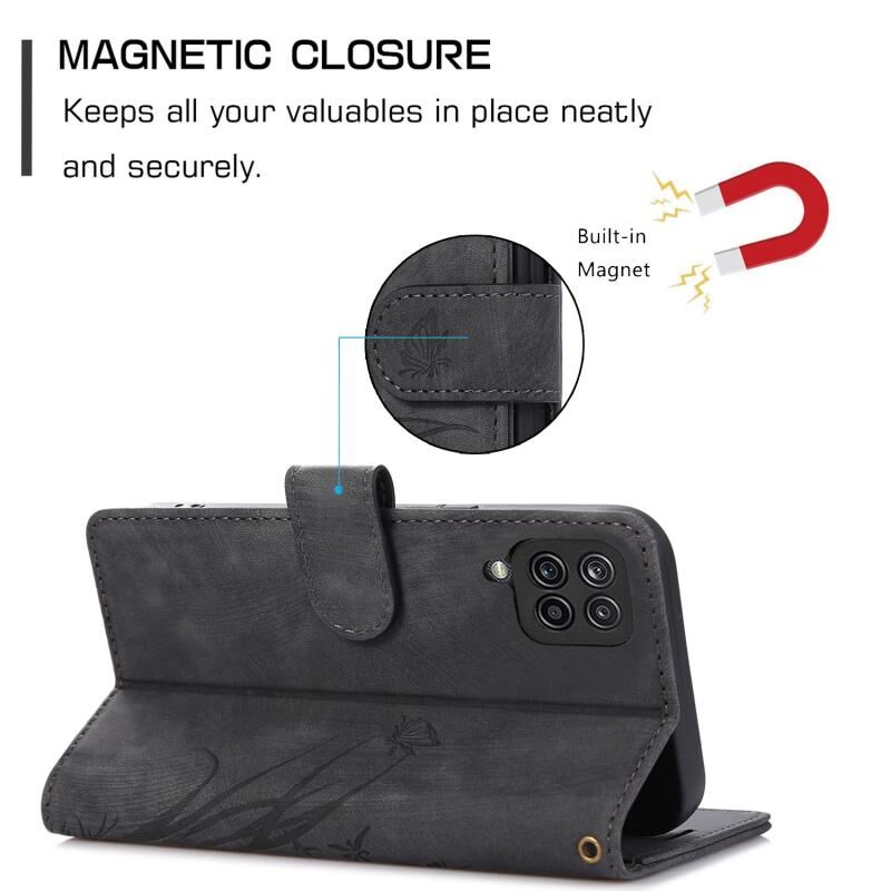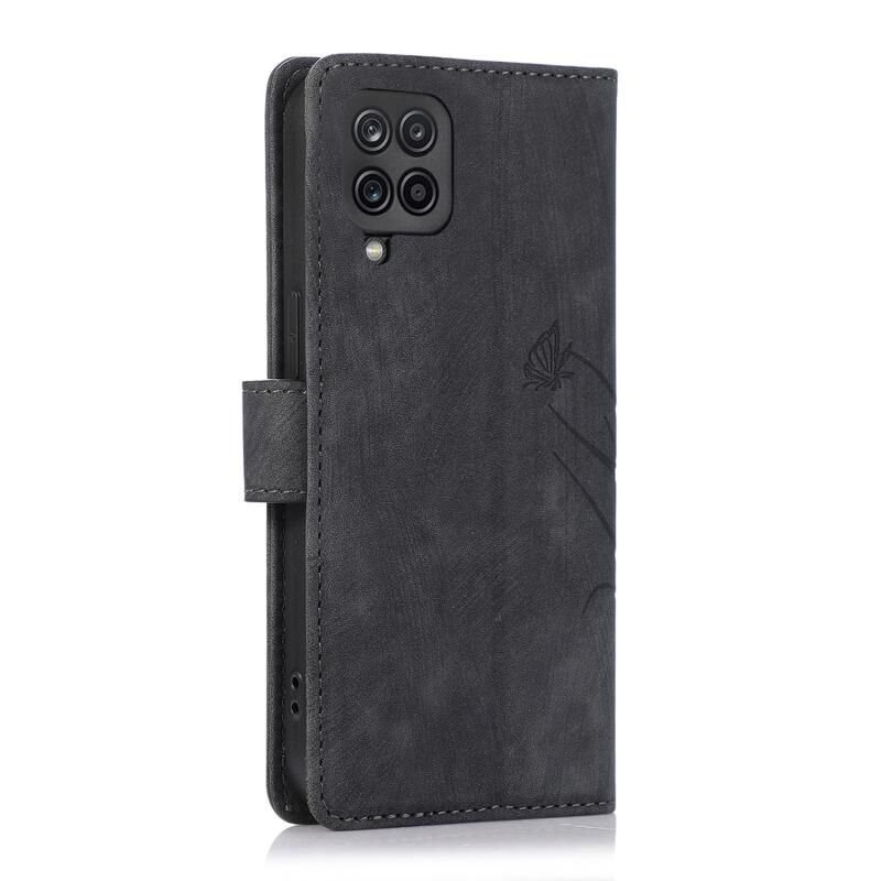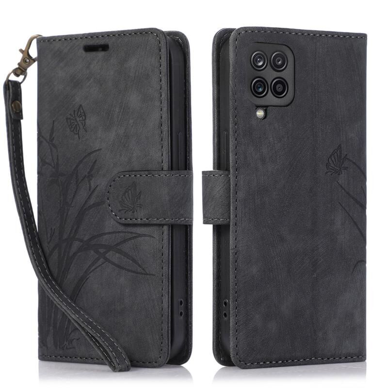 Θήκη τηλεφώνου δερμάτινη ανάγλυφη με σχέδιο ορχιδέας και πεταλούδας για Samsung Galaxy A12 / M12 (Μαύρο)