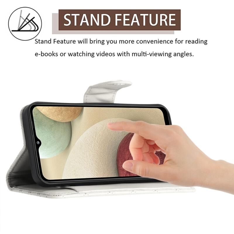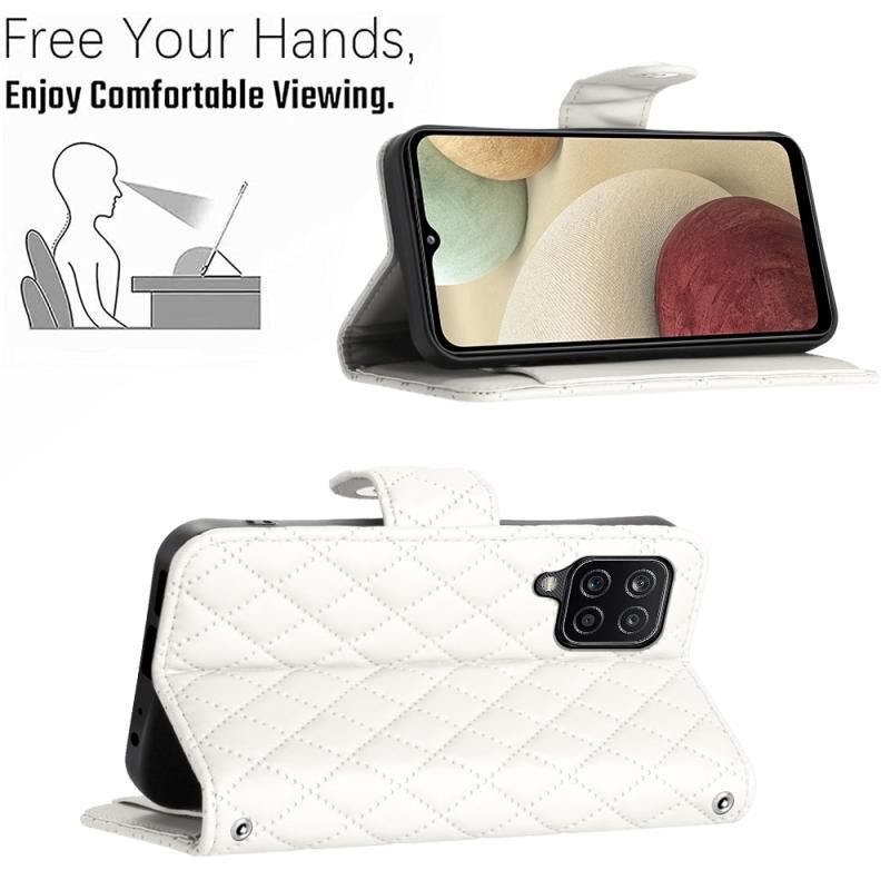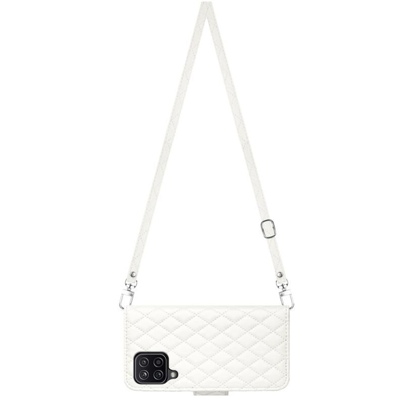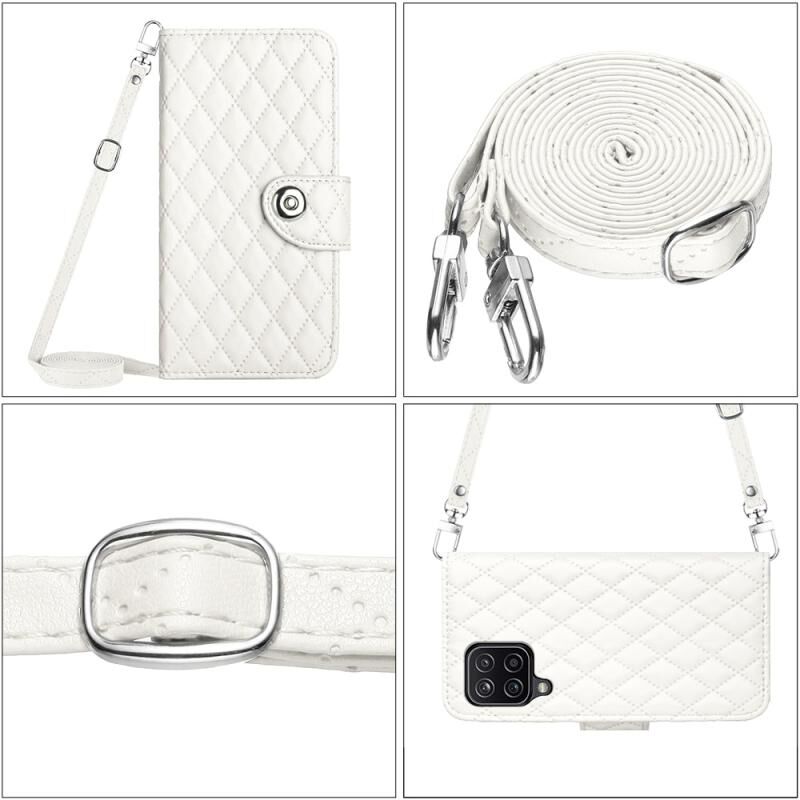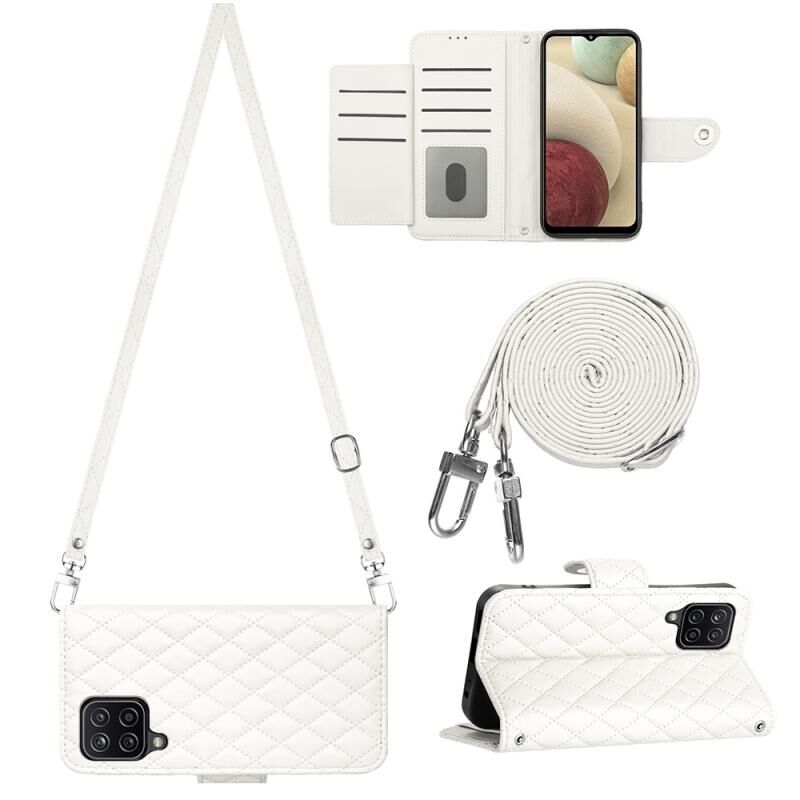 Για Samsung Galaxy A12 / M12 Rhombic υφή Flip δερμάτινη θήκη τηλεφώνου με μακρύ κορδόνι (Λευκό)