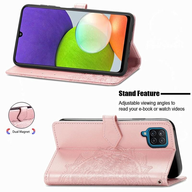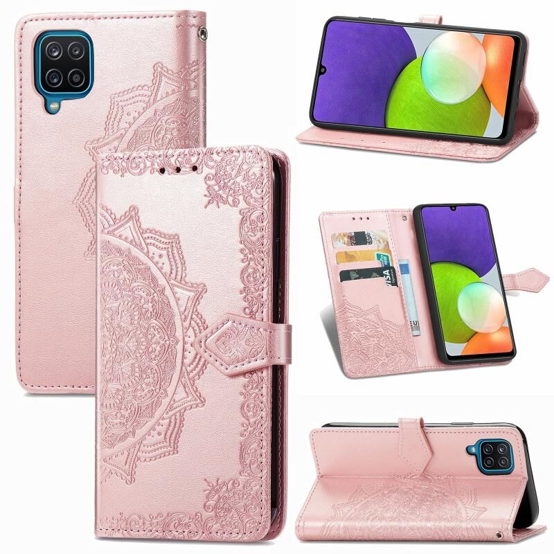 Για Samsung Galaxy A12 Mandala λουλούδι ανάγλυφο οριζόντια Flip δερμάτινη θήκη με θήκη & τρεις υποδοχές για κάρτες & πορτοφόλι & κορδόνι (Rose Gold)
