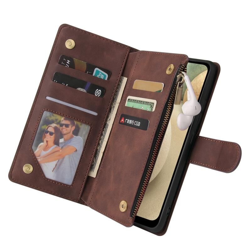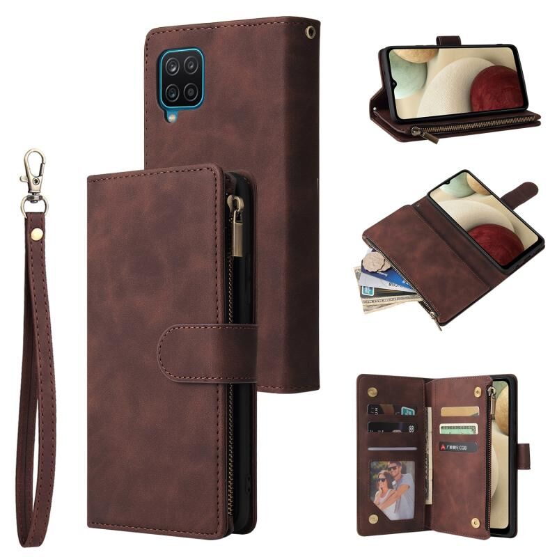 Για Samsung Galaxy A12 Πολυλειτουργικό παγωμένο φερμουάρ πορτοφόλι δερμάτινη θήκη τηλεφώνου (Καφέ)