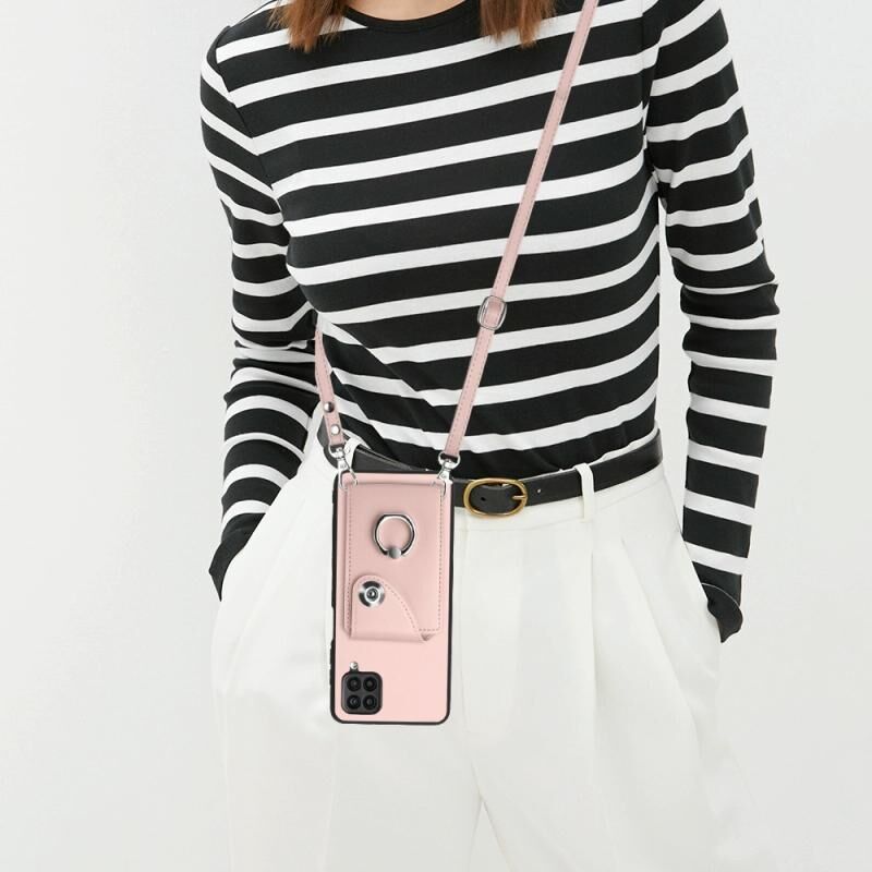 Για Samsung Galaxy A12 Οργανική κάρτα τσάντα τσάντα δαχτυλίδι κάτοχος υπόθεση τηλεφώνου με μακρύ κορδόνι (ροζ)