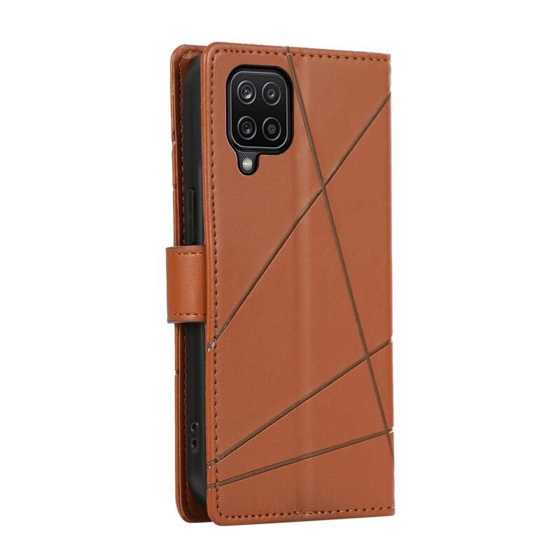 Θήκη τηλεφώνου Samsung Galaxy A12 από γνήσιο δέρμα PU με ανάγλυφη υφή και λεπτομέρειες γραμμής (Μπλε)