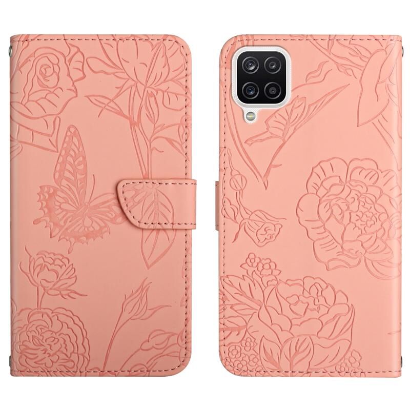 Θήκη τηλεφώνου Samsung Galaxy A12 με ανάγλυφο σχέδιο πεταλούδας και παιώνιας, δερμάτινη υφή (Κόκκινο)