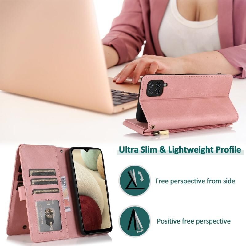 Για Samsung Galaxy A12 Skin-feel Crazy Horse υφή φερμουάρ τσάντα πορτοφόλι οριζόντια Flip δερμάτινη θήκη με κάτοχο & υποδοχές για κάρτες & πορτοφόλι & Lanyard (Rose Gold)
