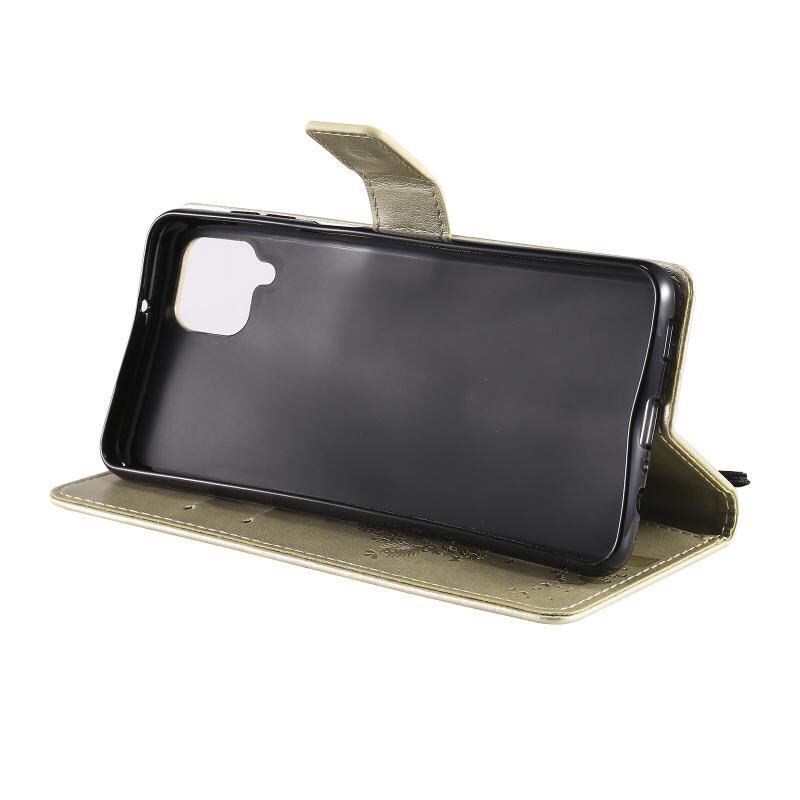 Για το Samsung Galaxy A12 Tree & Cat Pattern Pressed Printing Horizontal Flip PU Leather Case με θήκη & υποδοχές για κάρτες & πορτοφόλι & κορδόνι (Χρυσός)