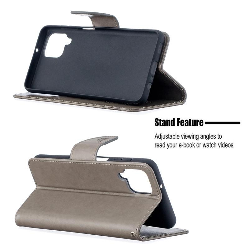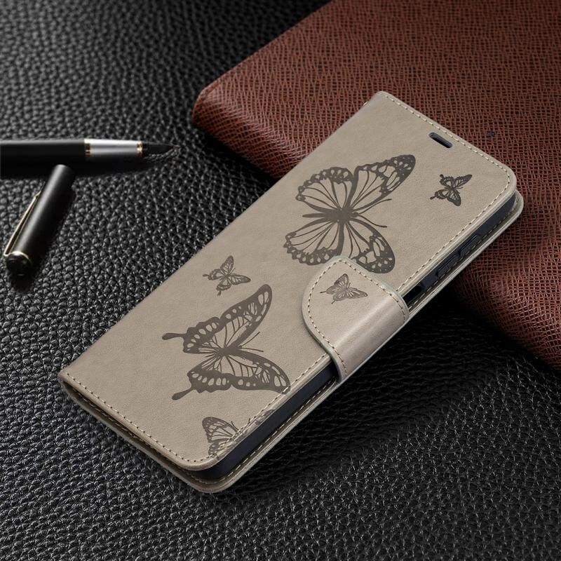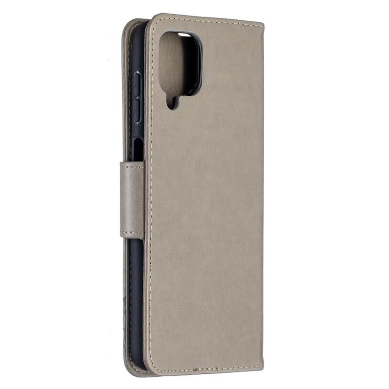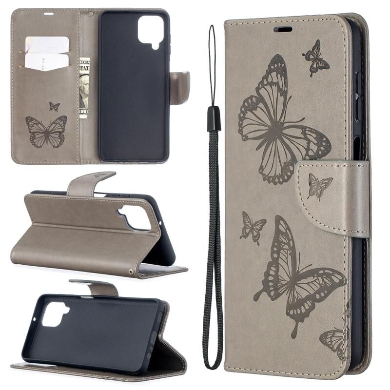 Θήκη Samsung Galaxy A12 Οριζόντια Δερμάτινη με σχέδιο από δύο πεταλούδες σε ανάγλυφο, με βάση, θήκη για κάρτες, πορτοφόλι και λουρί (Σκούρο Μπλε)