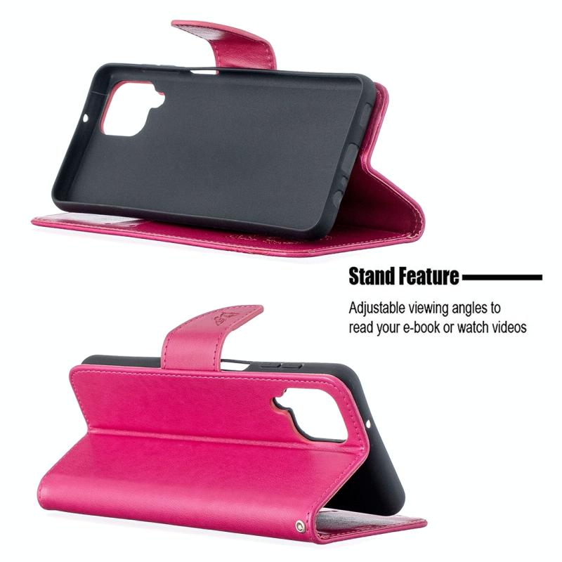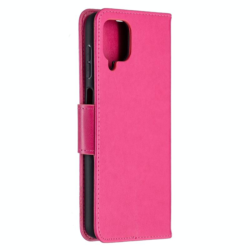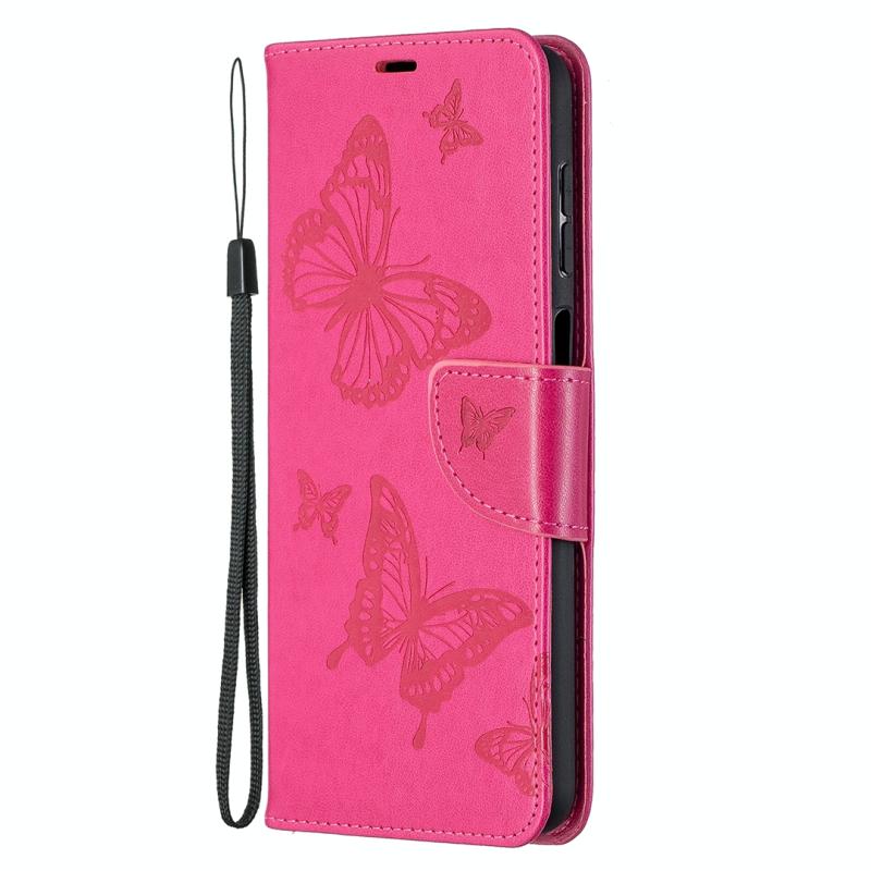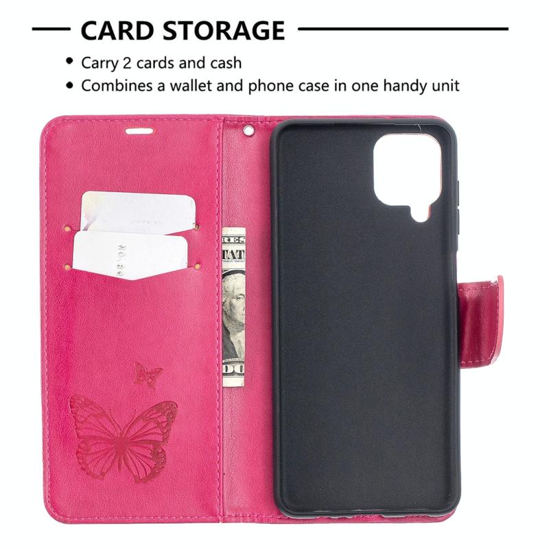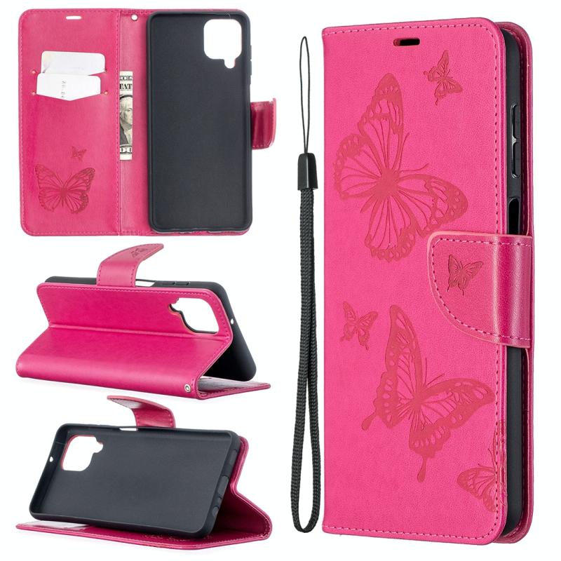 Θήκη Samsung Galaxy A12 Οριζόντια Δερμάτινη με σχέδιο από δύο πεταλούδες σε ανάγλυφο, με βάση, θήκη για κάρτες, πορτοφόλι και λουρί (Σκούρο Μπλε)