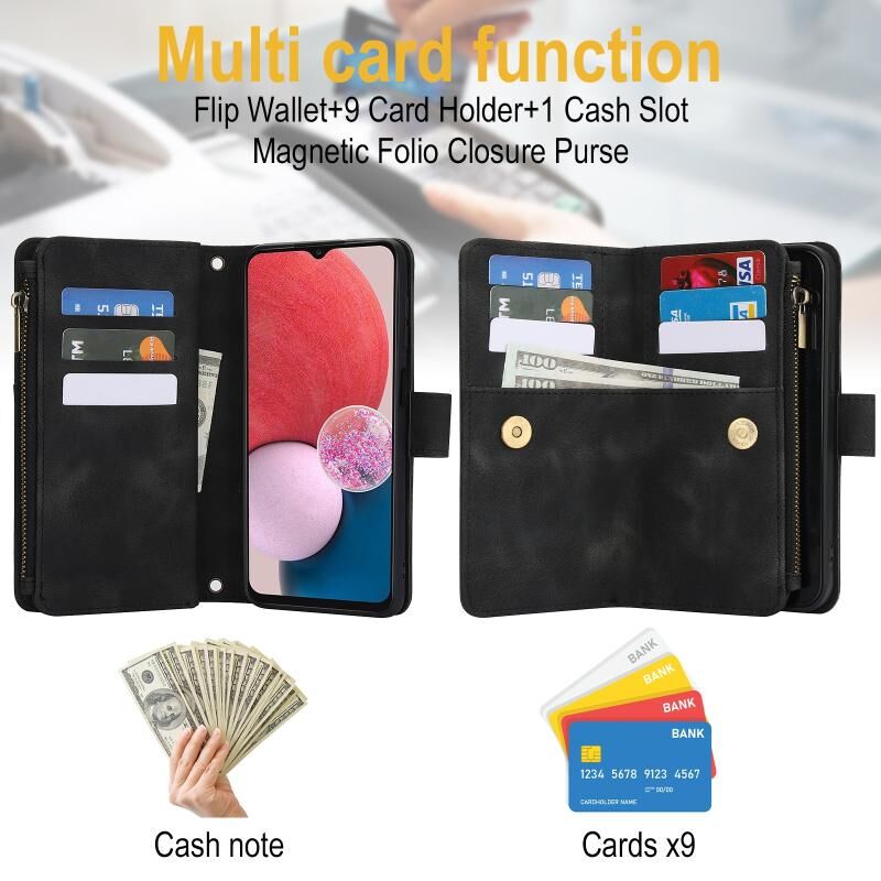2. Λειτουργία πορτοφολιού πολλαπλών καρτών: 9 υποδοχές για κάρτες και 1 θήκη μετρητών με φερμουάρ για να αποθηκεύετε τις πιστωτικές σας κάρτες, μετρητά ή μικρά χαρτονομίσματα για τις καθημερινές σας ανάγκες.