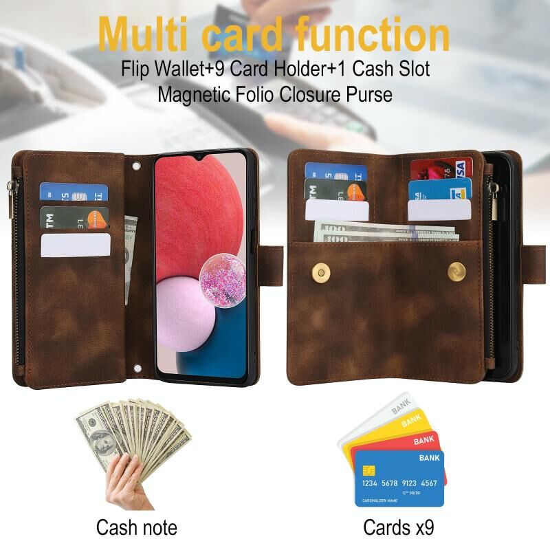 2. Λειτουργία πορτοφολιού πολλαπλών καρτών: 9 υποδοχές για κάρτες και 1 θήκη μετρητών με φερμουάρ για να αποθηκεύετε τις πιστωτικές σας κάρτες, μετρητά ή μικρά χαρτονομίσματα για τις καθημερινές σας ανάγκες.