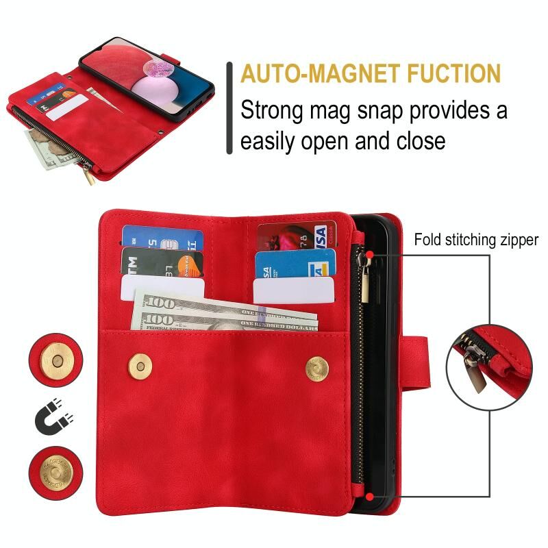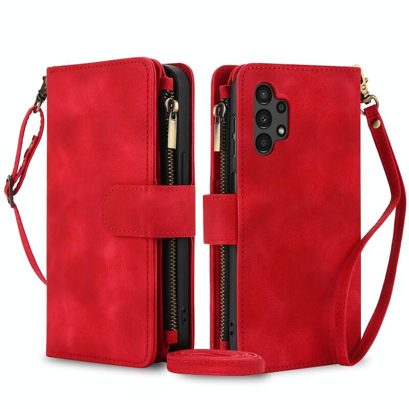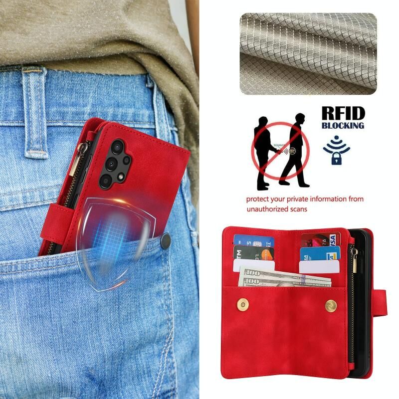 Για Samsung Galaxy A13 4G / 5G Dream 9-Card φερμουάρ πορτοφόλι RFID δερμάτινη θήκη τηλεφώνου με κορδόνι (κόκκινο)