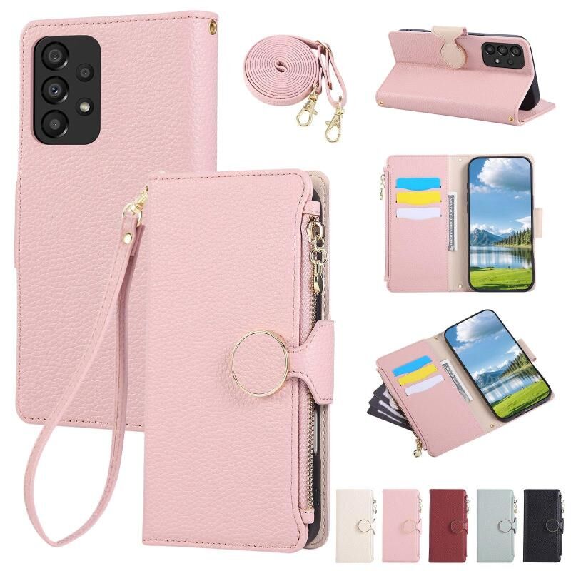 For Samsung Galaxy A13 4G / 5G Round Buckle Zipper Wallet Leather Phone Case with Crossbody Strap(Pink)