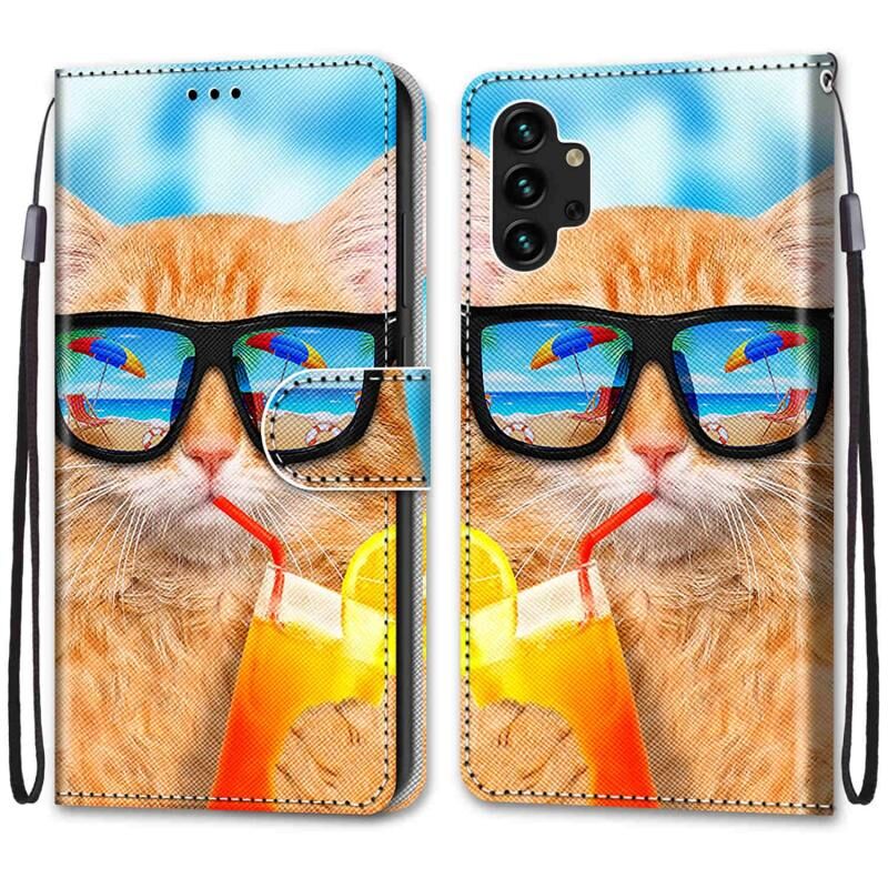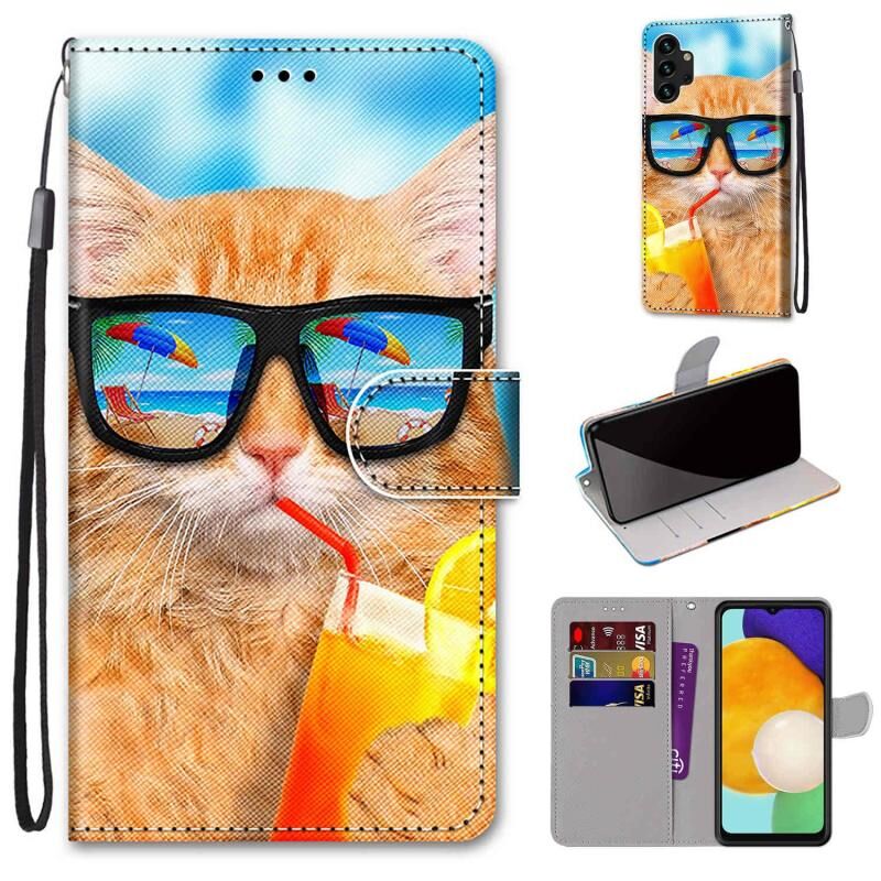 Θήκη τηλεφώνου Samsung Galaxy A13 4G από δέρμα με οριζόντιο άνοιγμα, πολύχρωμο σχέδιο με υφή σταυρού, με βάση στήριξης, θήκες για κάρτες, πορτοφόλι και κορδόνι (Γάτα που πίνει αναψυκτικό)