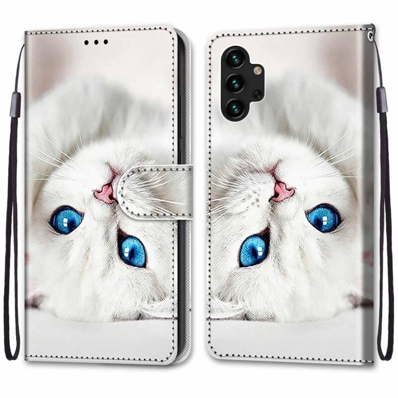 Θήκη τηλεφώνου Samsung Galaxy A13 4G, δερμάτινη, οριζόντια, με σχέδιο ζωγραφικής και ανάγλυφη υφή, με βάση στήριξης, θήκες για κάρτες, πορτοφόλι και λουρί (Λευκό Γατάκι)