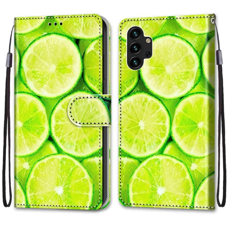 Θήκη τηλεφώνου Samsung Galaxy A13 4G από δέρμα PU με οριζόντιο άνοιγμα, ανάγλυφη υφή, πολύχρωμο σχέδιο (Lime), με βάση, θήκες καρτών, πορτοφόλι και κορδόνι.
