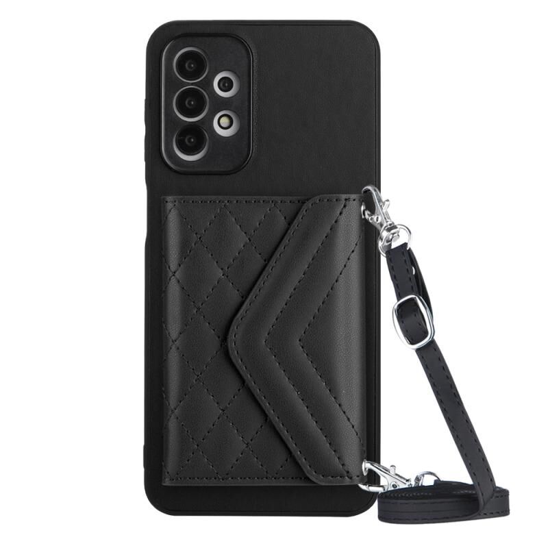 Για Samsung Galaxy A13 4G Rhombic υφή κάρτα τσάντα RFID υπόθεση τηλεφώνου με μακρύ κορδόνι (Μαύρο)