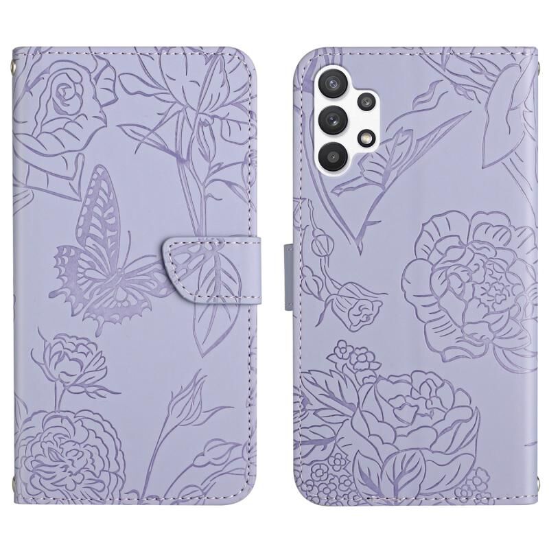 Θήκη τηλεφώνου Samsung Galaxy A13 4G με δερμάτινη υφή, ανάγλυφο σχέδιο πεταλούδας και παιώνιας (Μωβ)