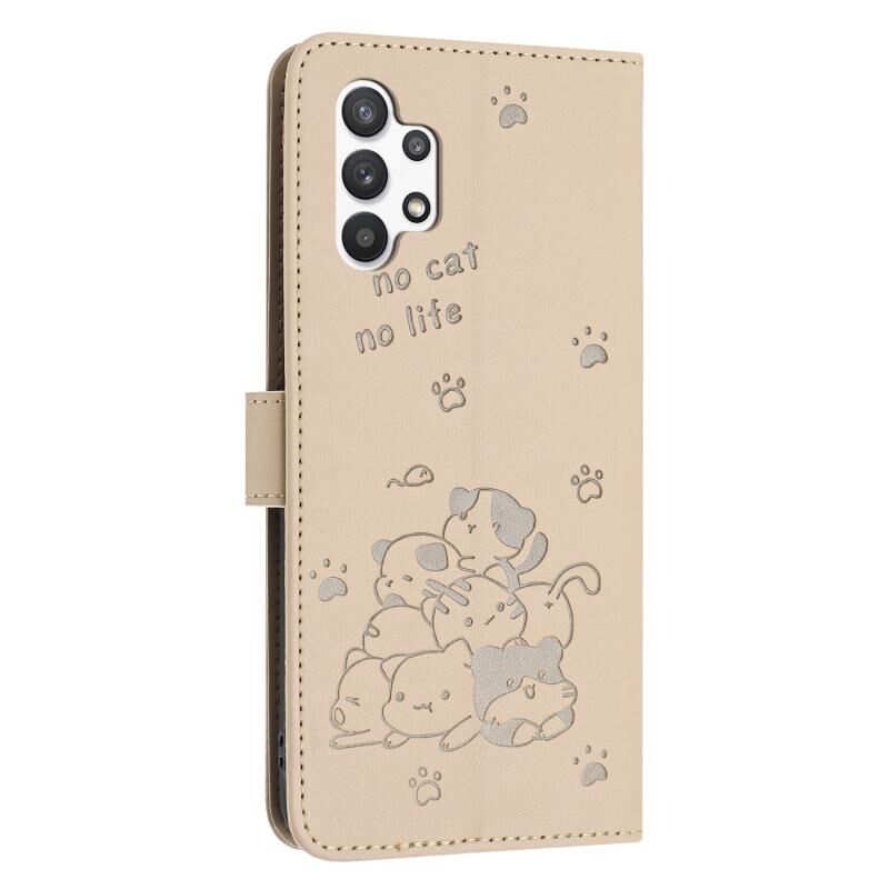 Θήκη δερμάτινη για Samsung Galaxy A13 5G / 4G με ανάγλυφο σχέδιο γατάκι και κορδόνι (Μπεζ)
