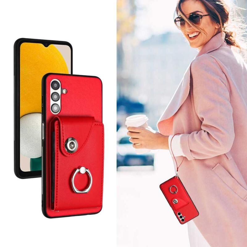 Για Samsung Galaxy A13 5G/A04s Οργανική κάρτα τσάντα δαχτυλίδι κάτοχος PU θήκη τηλεφώνου με κορδόνι (Κόκκινο)