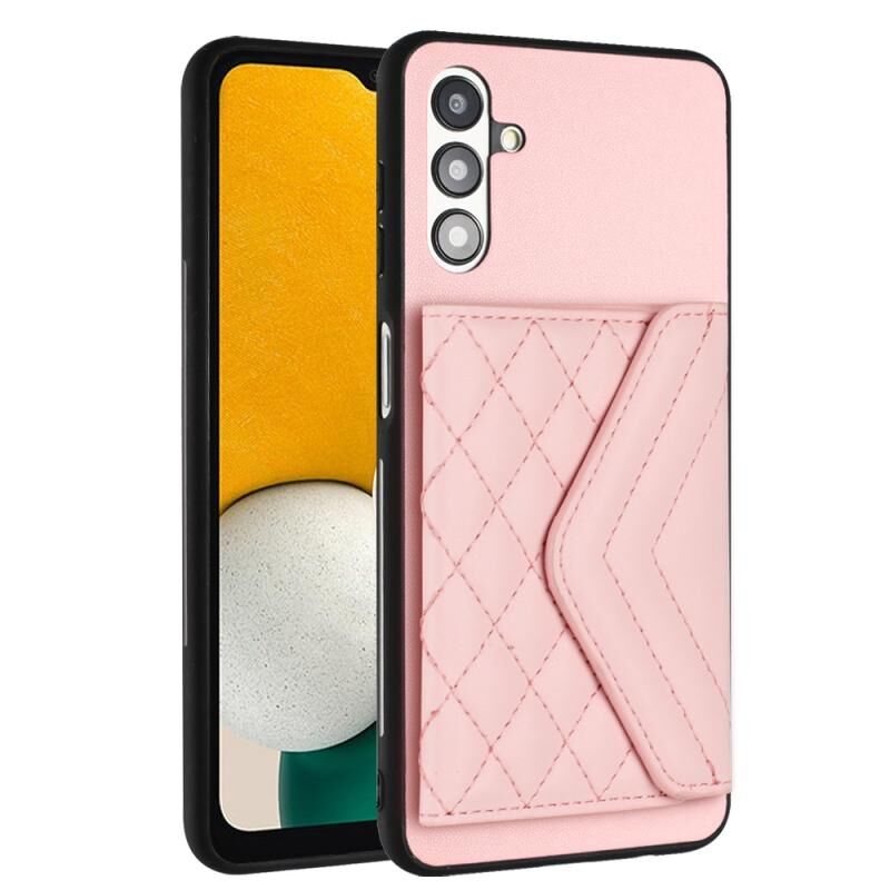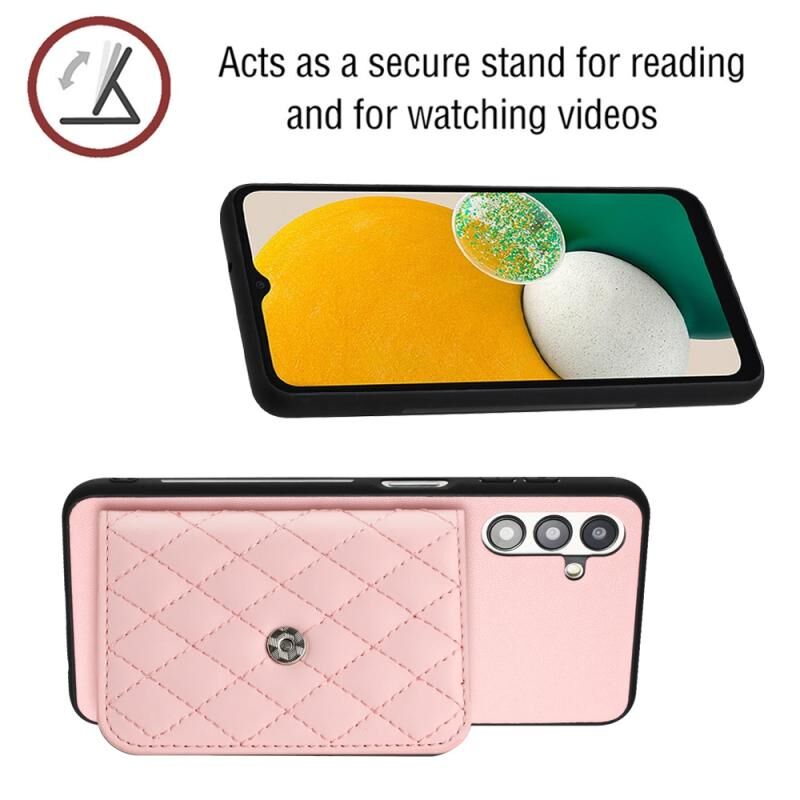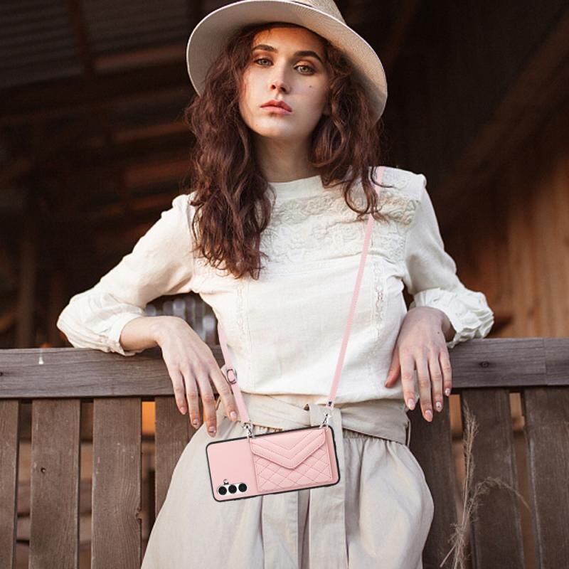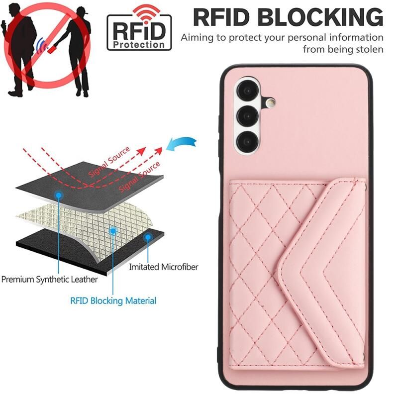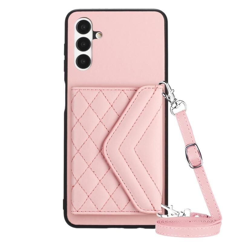Για Samsung Galaxy A13 5G / A04s Rhombic Υφή κάρτα τσάντα RFID υπόθεση τηλεφώνου με μακρύ κορδόνι (Rose Gold)