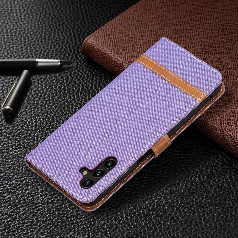 Για Samsung Galaxy A13 5G Χρώμα Matching Denim Υφή δερμάτινη θήκη με θήκη & υποδοχές για κάρτες & πορτοφόλι & κορδόνι (μωβ)