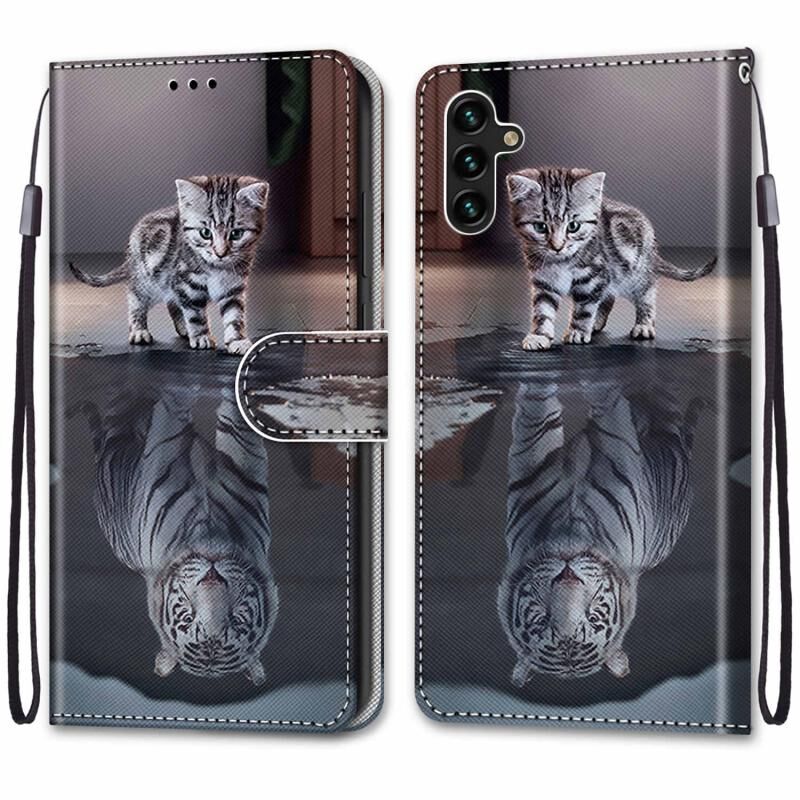 Θήκη τηλεφώνου Samsung Galaxy A13 5G από δέρμα με οριζόντιο άνοιγμα, πολύχρωμο σχέδιο, ανάγλυφη υφή, με βάση, θήκες καρτών, πορτοφόλι και κορδόνι (Γάτα που μεταμορφώνεται σε τίγρη)