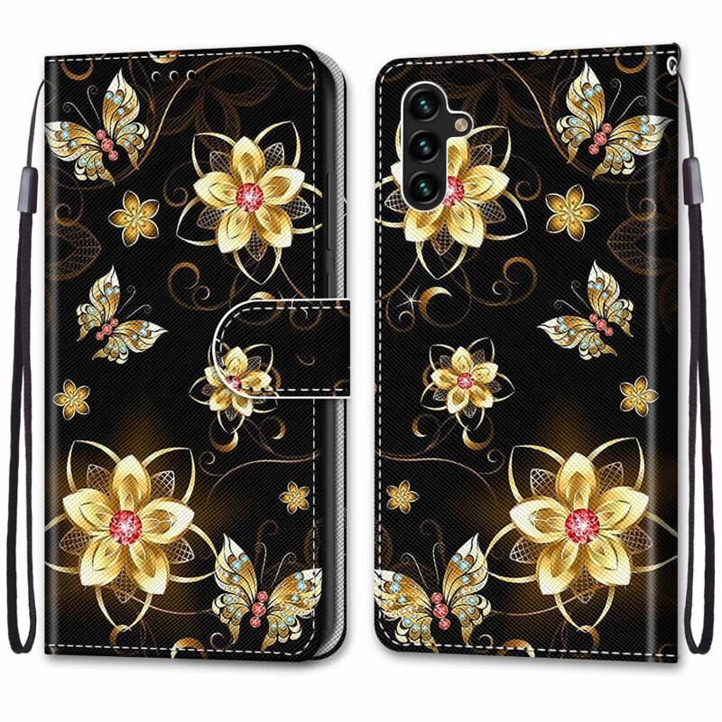 Θήκη τηλεφώνου Samsung Galaxy A13 5G από δέρμα με οριζόντιο άνοιγμα, πολύχρωμο σχέδιο με ανάγλυφη υφή, με βάση, θήκες καρτών, πορτοφόλι και κορδόνι (Ροζ Λουλούδια - Πύργος της Γέφυρας).