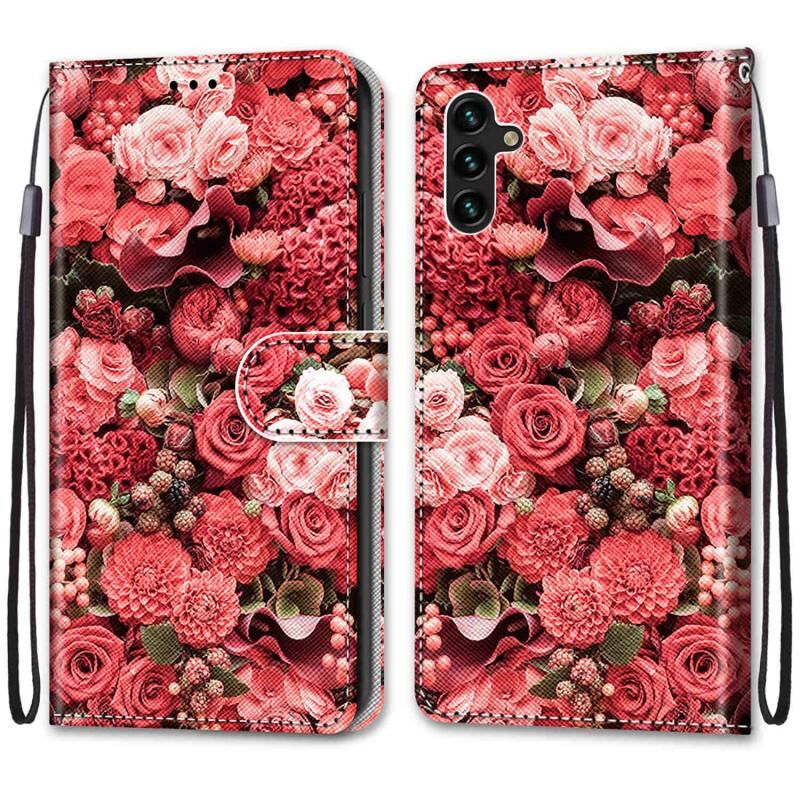 Θήκη τηλεφώνου Samsung Galaxy A13 5G από δέρμα με οριζόντιο άνοιγμα, πολύχρωμο σχέδιο με ανάγλυφη υφή, με βάση, θήκες καρτών, πορτοφόλι και κορδόνι (Ροζ Λουλούδια - Πύργος της Γέφυρας).