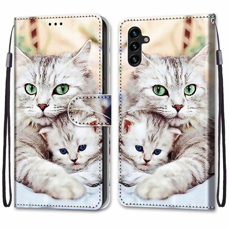 Θήκη τηλεφώνου Samsung Galaxy A13 5G από δέρμα PU με οριζόντιο άνοιγμα, ανάγλυφη υφή, πολύχρωμο σχέδιο (Μεγάλη γάτα που αγκαλιάζει γατάκι), με βάση, θήκες καρτών, πορτοφόλι και κορδόνι.